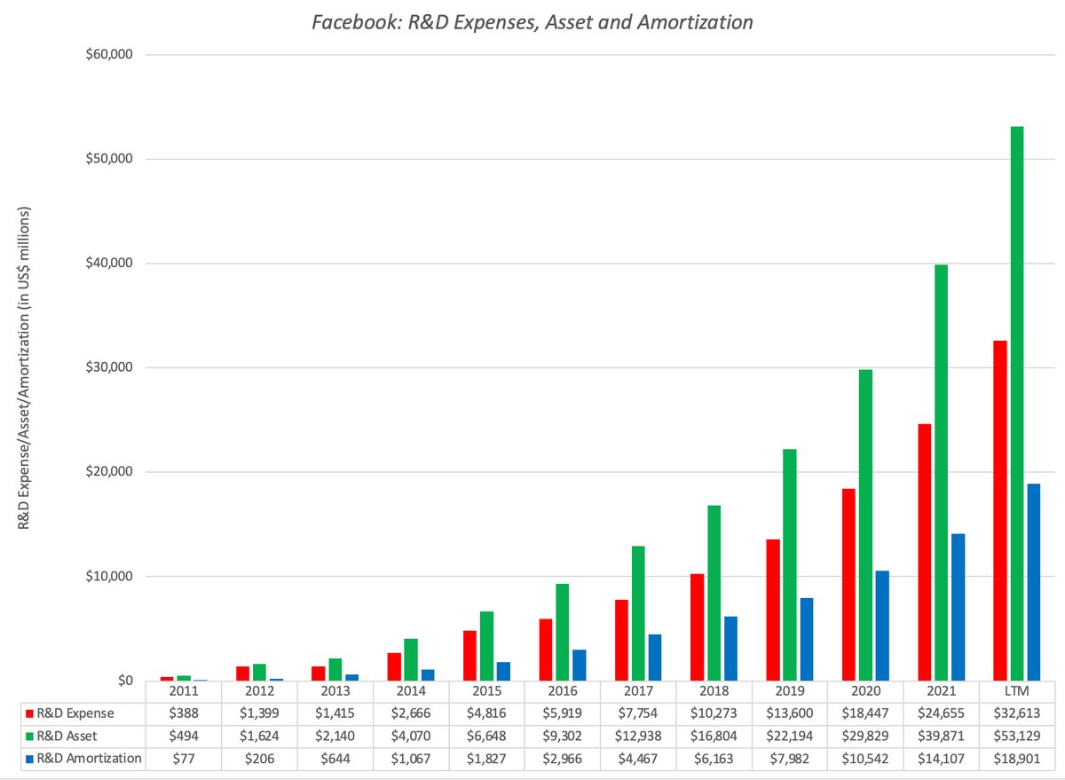 Facebook not only spent a massive amount on R&D in the last 12 months ($32 billion+), but has also increased that spending manifold over the last five years. Capitalizing R&D creates a significant asset ($53 billion+) and augments book equity. bit.ly/3UJCiaX