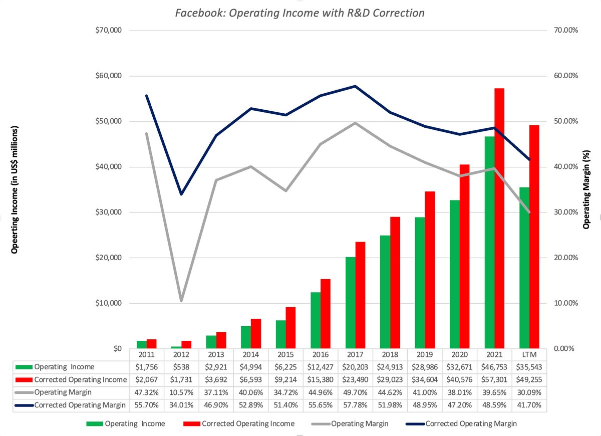 Capitalizing R&D at Facebook increases income by $13.7 billion, increasing operating income in the last 12 months from $35.54 billion to $49.26 billion and net income from $28.8 billion to $42.5 billion; operating margin increases from 30.1% to 41.7%. bit.ly/3UJCiaX