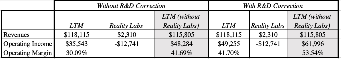 Facebook's R&D does not include a big chunk of the company's bet on the Metaverse, and adjusting for that bet (by removing the revenues and expenses associated with Reality Labs) remakes Facebook's profit picture. bit.ly/3UJCiaX