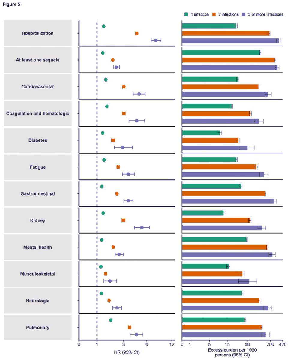 ⚠️AVOID INFECTION—Risk of death, hospitalization from #COVID19 jumps significantly with reinfection compared with 1 or no infection. Problem goes beyond vaccinated or unvaccinated. ➡️Each infection you accumulate more risk.🧵