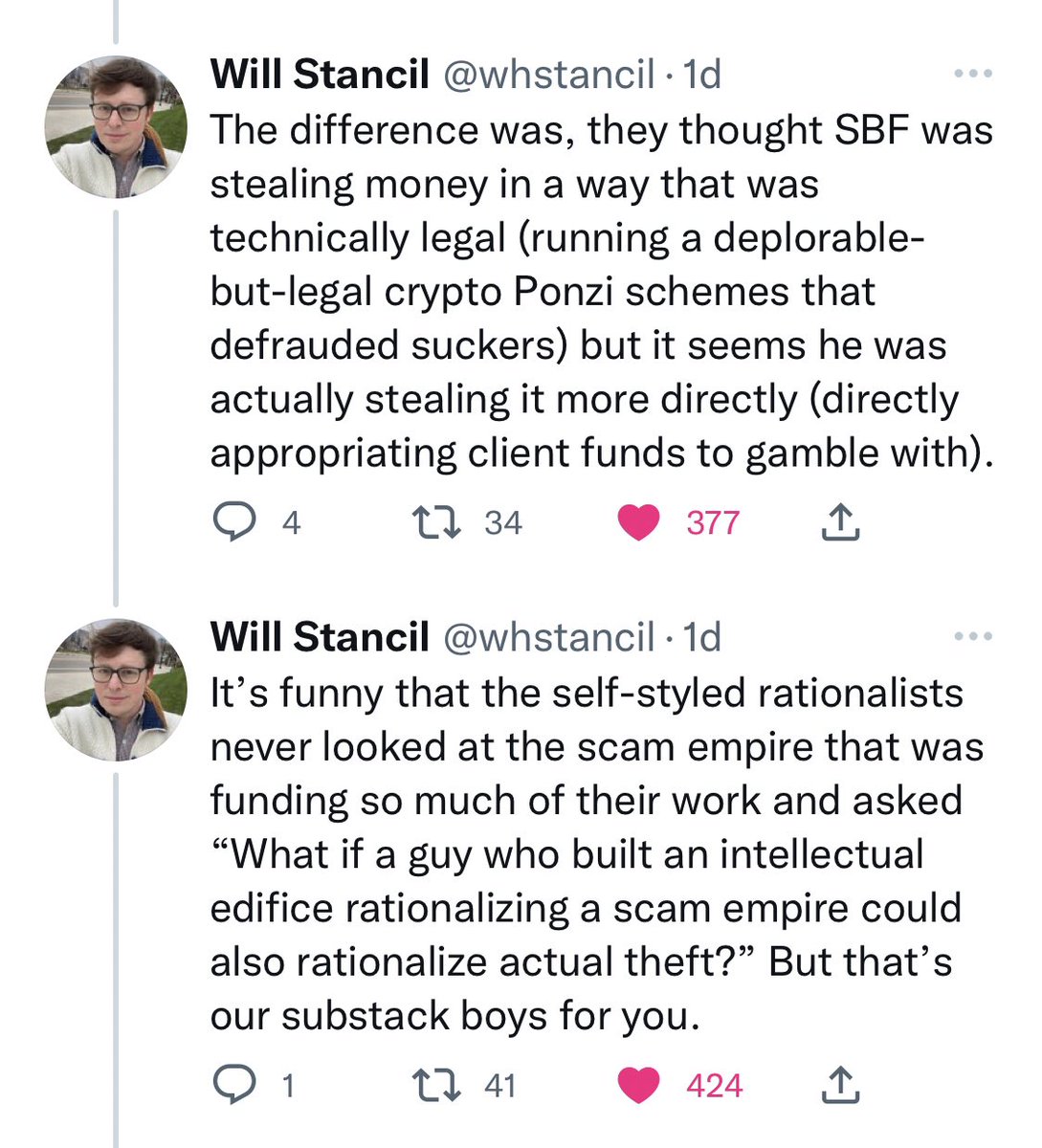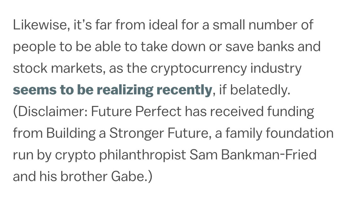 A lil paragraph in it about how billion dollar fraud is “far from ideal” but, mm, no real reckoning with what the fuck kind of client-journalism they think they’re doing. vox.com/future-perfect…
