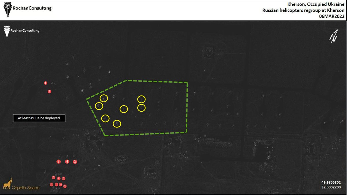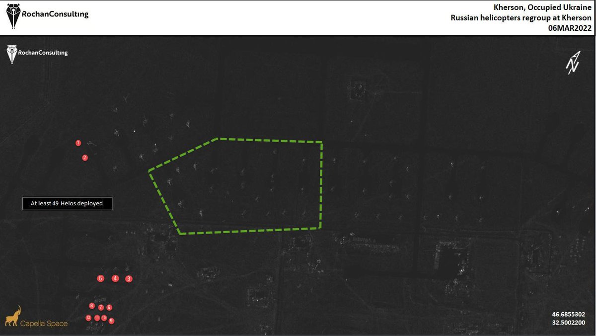 5/Capella Space image, dated 6-Mar-2022. It's a bit tricky, by you can positively identify the 12 Ukr helicopters from previous sat image. The rest with the exception of up to 4-5 pieces are safely assumed to be russian. Pay special attention to the enclosed area. Image