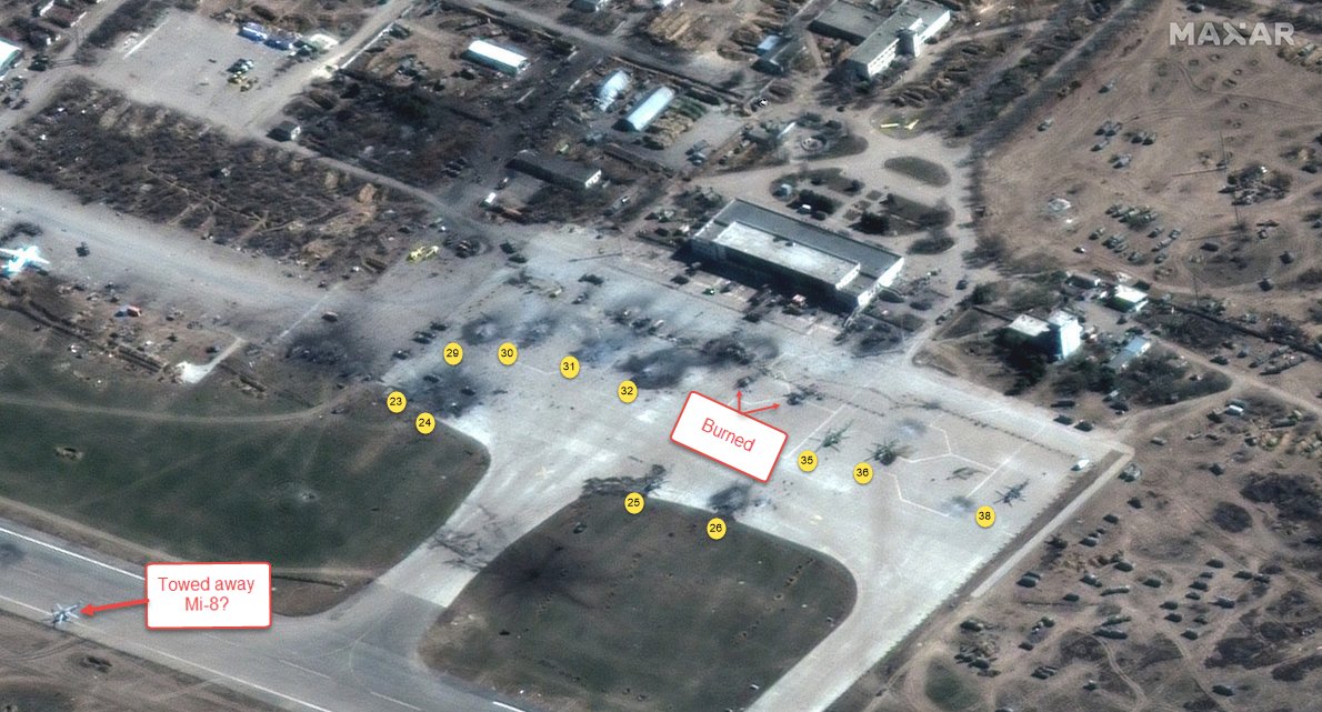 18/Maxar sat image. No earlier than midday of the 16th and no later than the 21st of March. 33 and 34 Mi-28N also towed away. Image