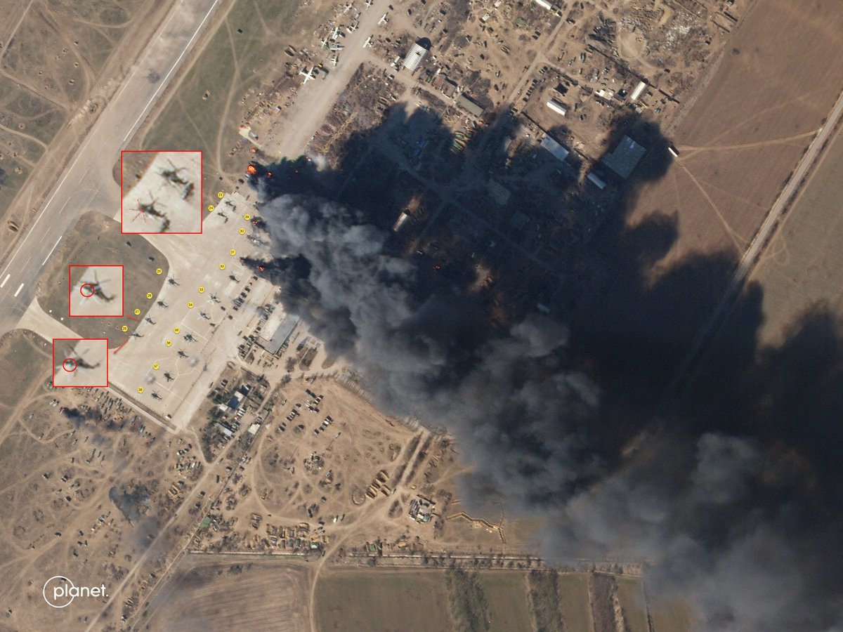 7/Part of the larger sat image by Planet Lab dated 15-Mar-2022. We can see the results of an attack that occurred no later than 12-Mar. The scorching matches the 12-Mar sat image. Some of the wrecks are located almost on the exact spots as some of the helis on the 6-Mar image. ImageImage