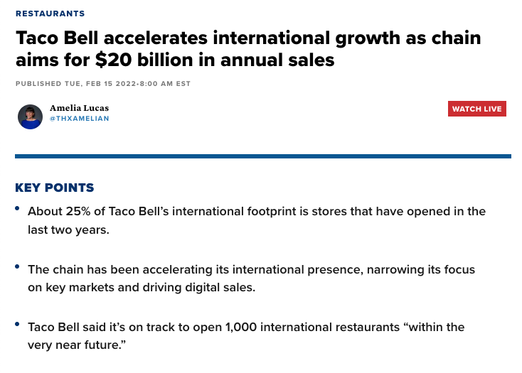 Taco Bell is currently planning a massive expansion overseas with the goal of 600+ new locations.