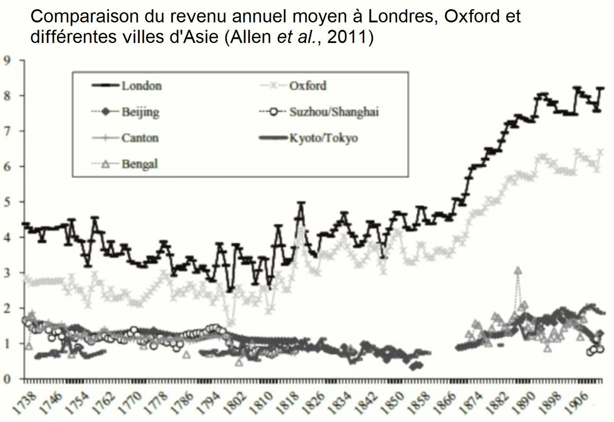 Robert Allen et al. (2011) ont également montré qu'au XVIIIe siècle, le revenu annuel d'un Londonien ou d'un habitant d'Oxford est déjà significativement plus élevé que celui d'un Pékinois ou d'un Shanghaïen. 21/25