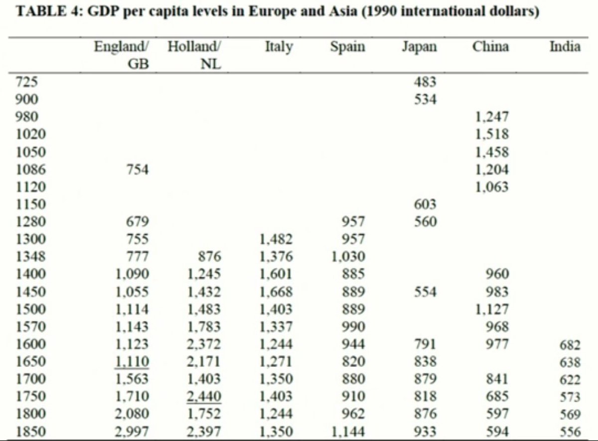 Si ces données sont correctes, on peut dire que la Grande Divergence précède de plusieurs siècles l'exploitation massive du charbon et l'expansion coloniale européenne du XIXe. Ces phénomènes ont sans doute aggravé la Divergence, mais ils n'en sont pas à l'origine. 22/25