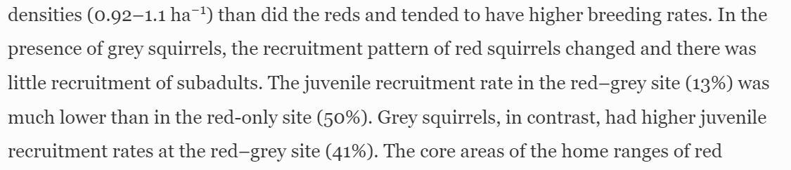 Lorsque les deux espèces cohabitent, les femelles des roux font moins de petits alors que les gris en font au contraire plus.