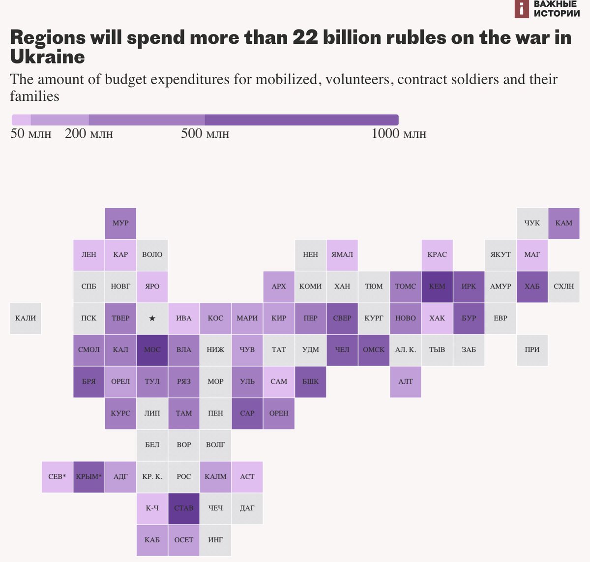 12/ iStories estimates that in total only 50 of Russia's 85 regions have already spent more than 22 billion rubles ($363.3m) on war costs – equivalent to the budget of some entire regions. The real figure is certainly higher as 35 regions have not released financial data.