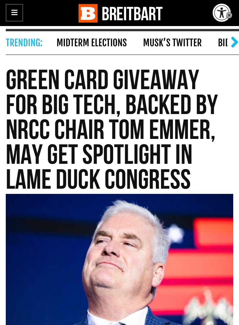 Tom Emmer also wants to give green card giveaways so that Big Tech can get more cheap labor from overseas.