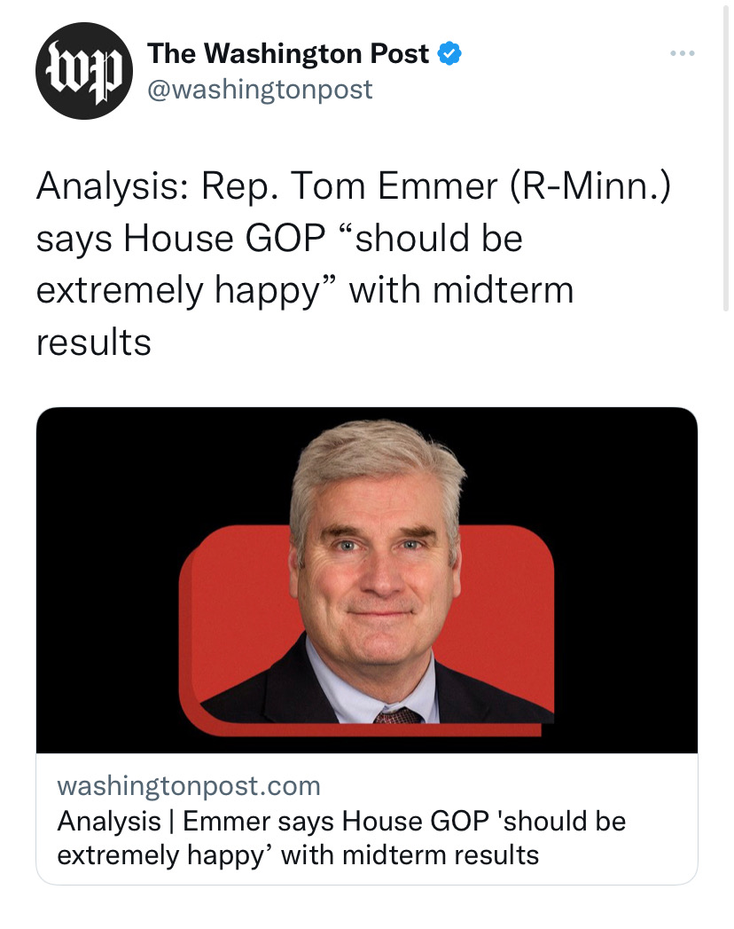 I've talked to a lot of people who work on the Hill who have told me that Tom Emmer was more focused in the last few months on running for whip than electing Republicans to Congress. If there's one man responsible for the lack of a red wave, it was him.