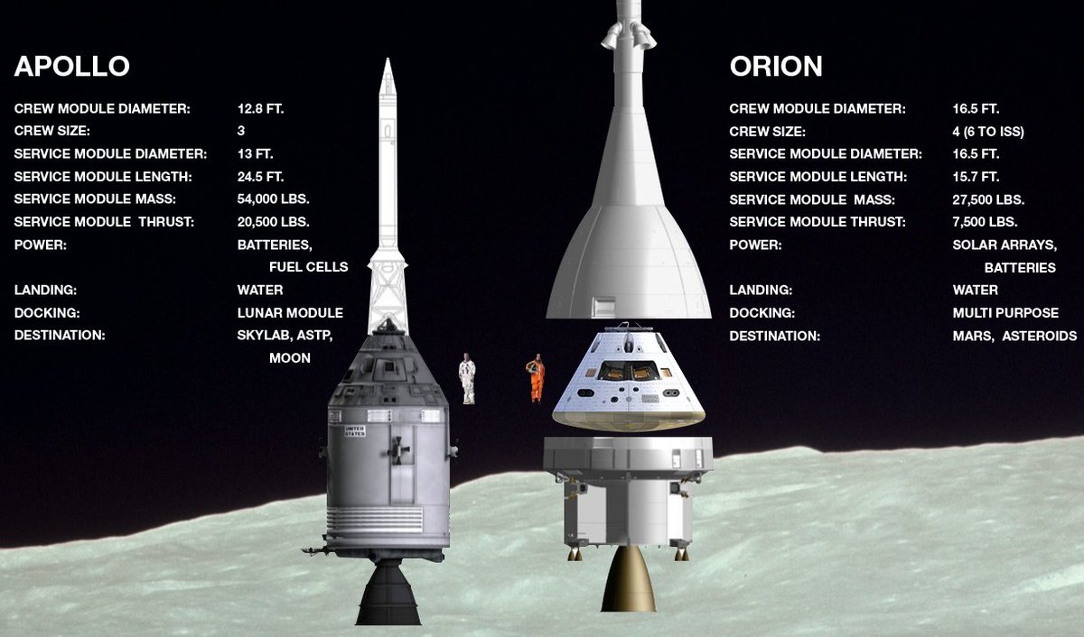 Плюс Orion сильно больше того же Apollo. А внутри аж 20 кубометров для 4 человек, против 9 кубометров для 3. Ещё системы Ориона рассчитаны на полёты от 21 дня до 6 месяцев (в режиме гибернации). Apollo позволял летать до 9 без поддержки. Заметный прогресс