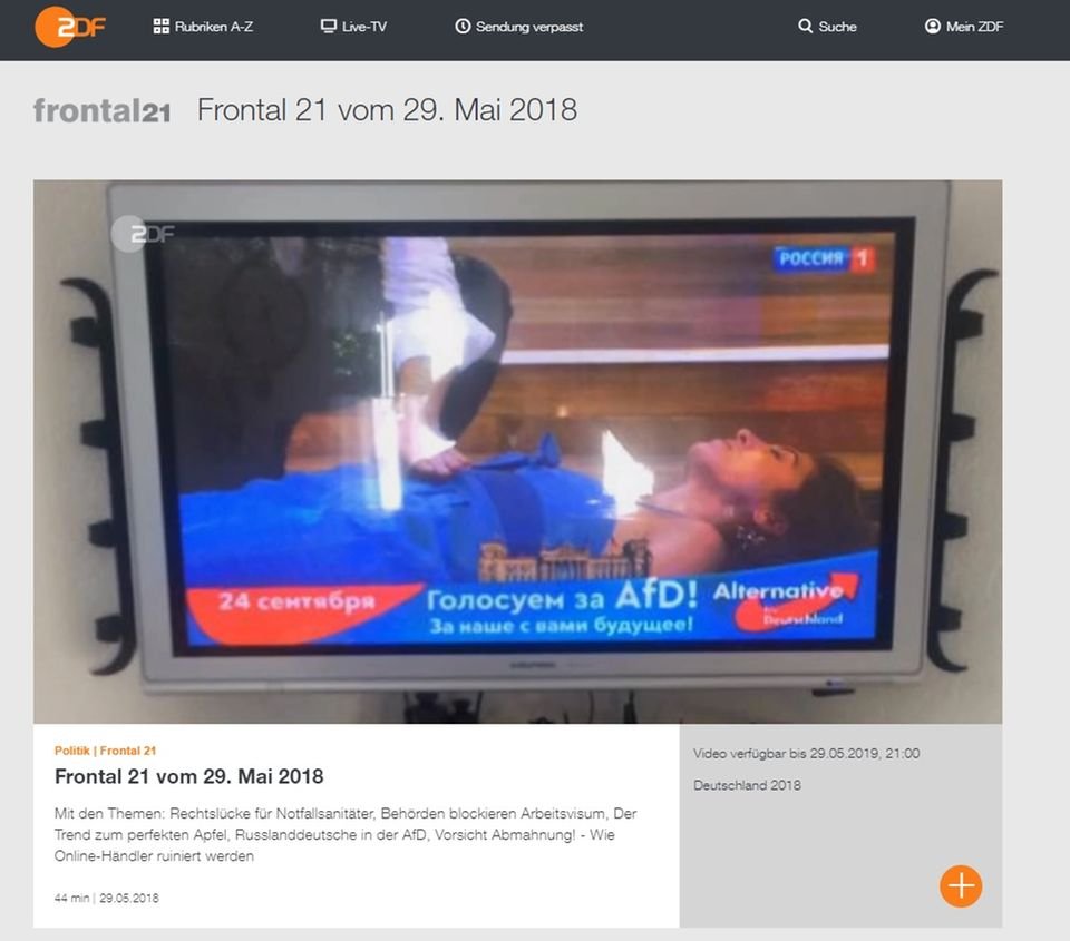 ...Im Jahr 2017 wurde über Kartina.tv u. a. auch der Sender "Rossija 1" in Deutschland verbreitet. In der Zeit vor der Bundestagswahl 2017 wurden über Kartina in laufende Sendungen Werbebanner eingeblendet, die die Wahl der #AfD empfahlen: 8/x