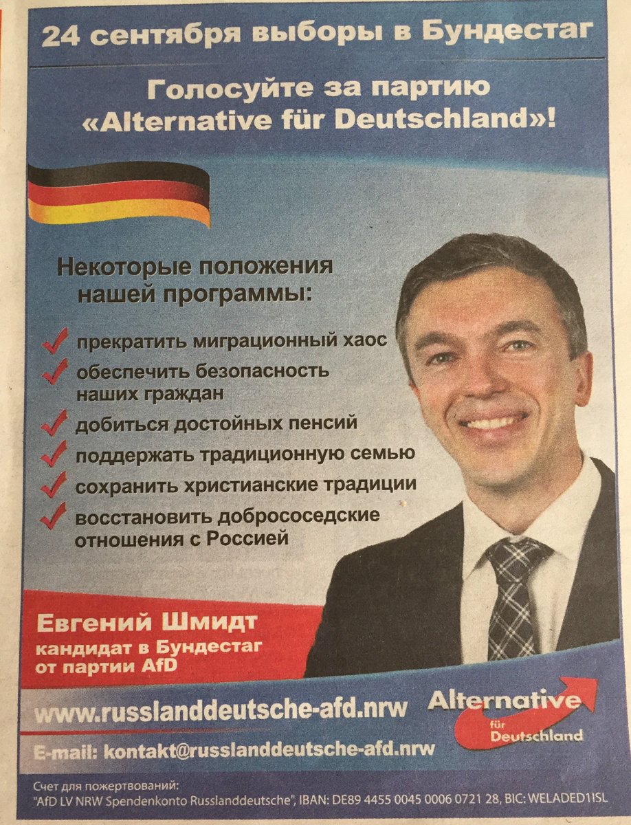 Der schlecht deutsch sprechende MdB Evgenij Schmidt, macht ja gerne auch russische Werbung für sich und die AfD (kscheib.de/7791-2/). ... 16/x