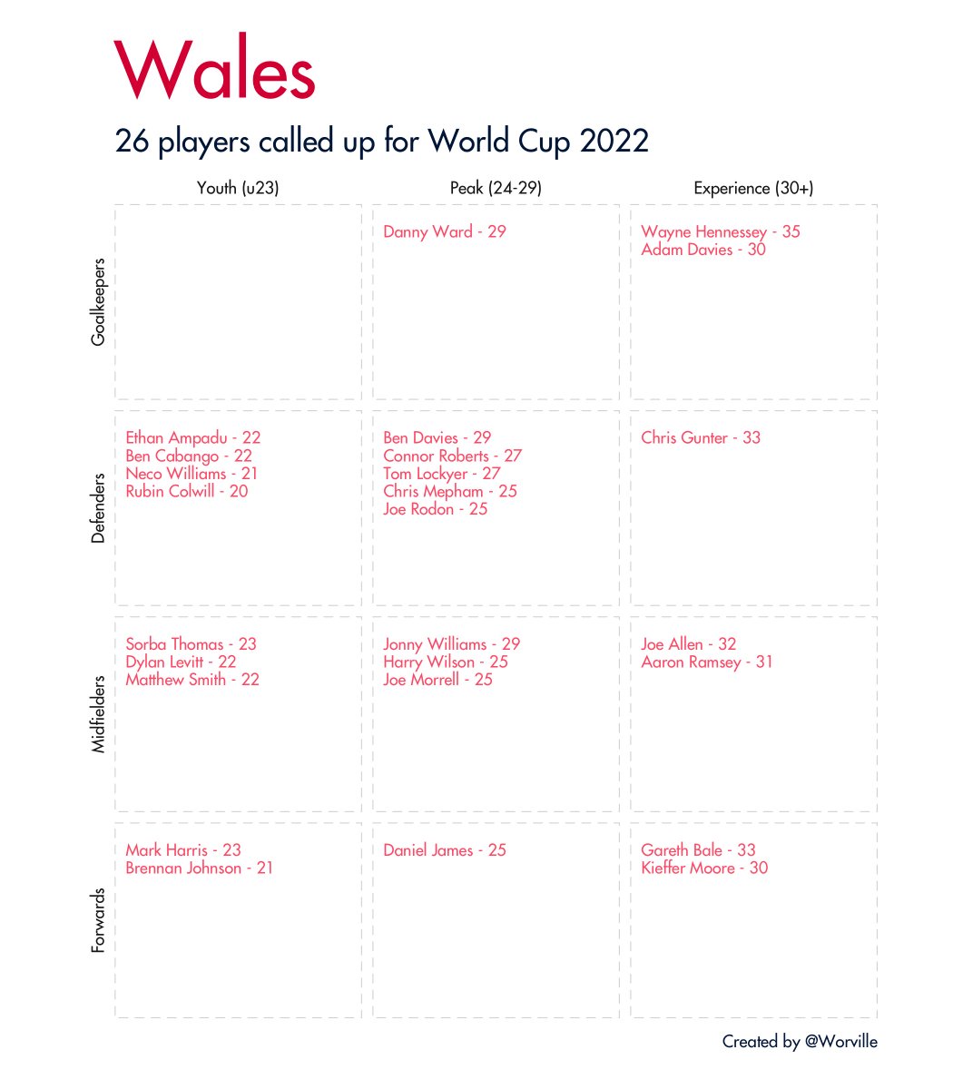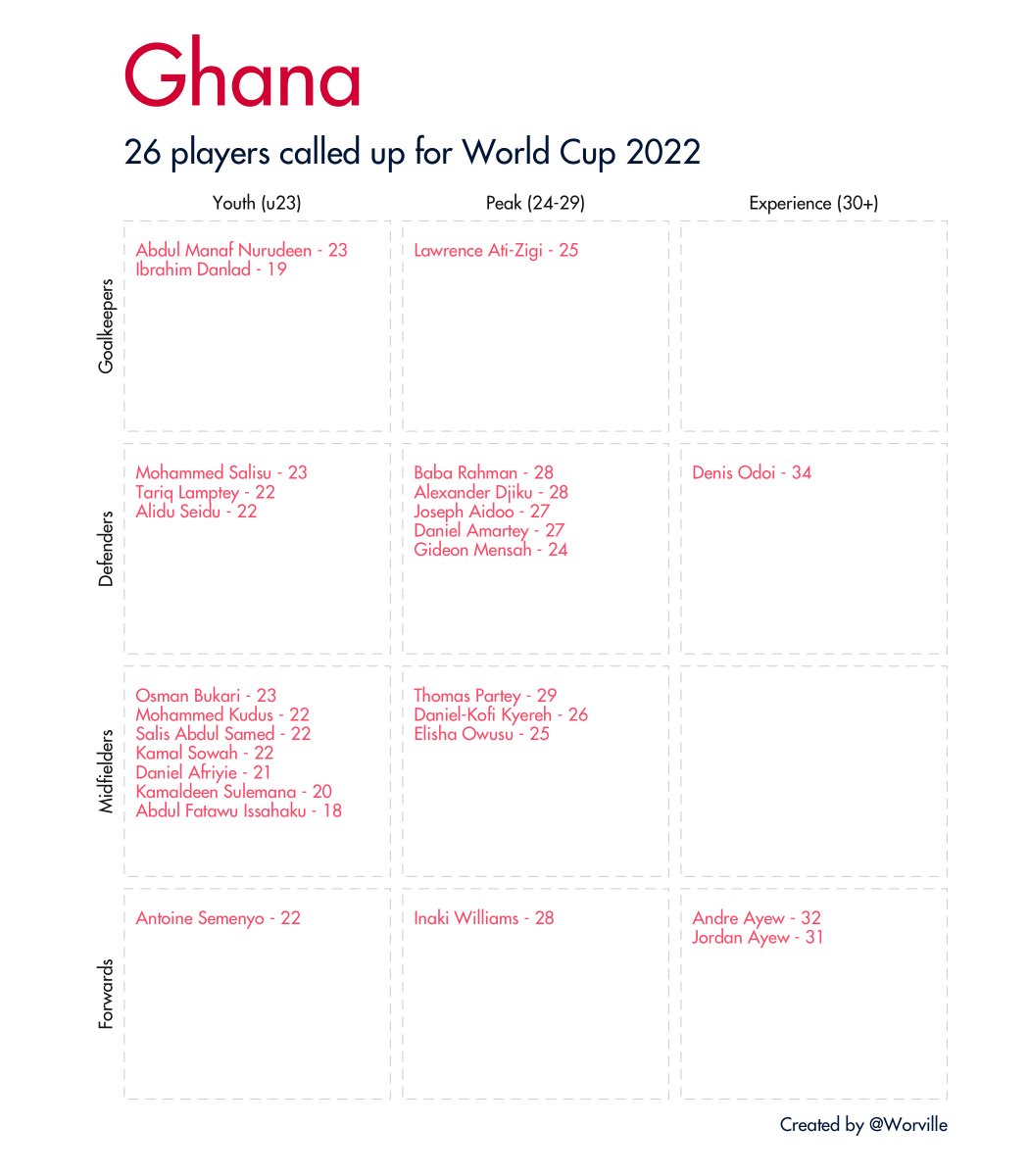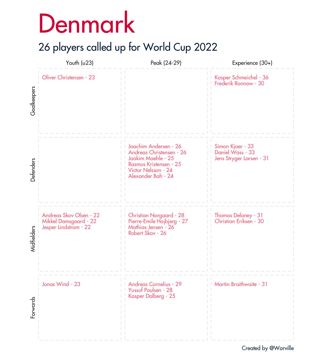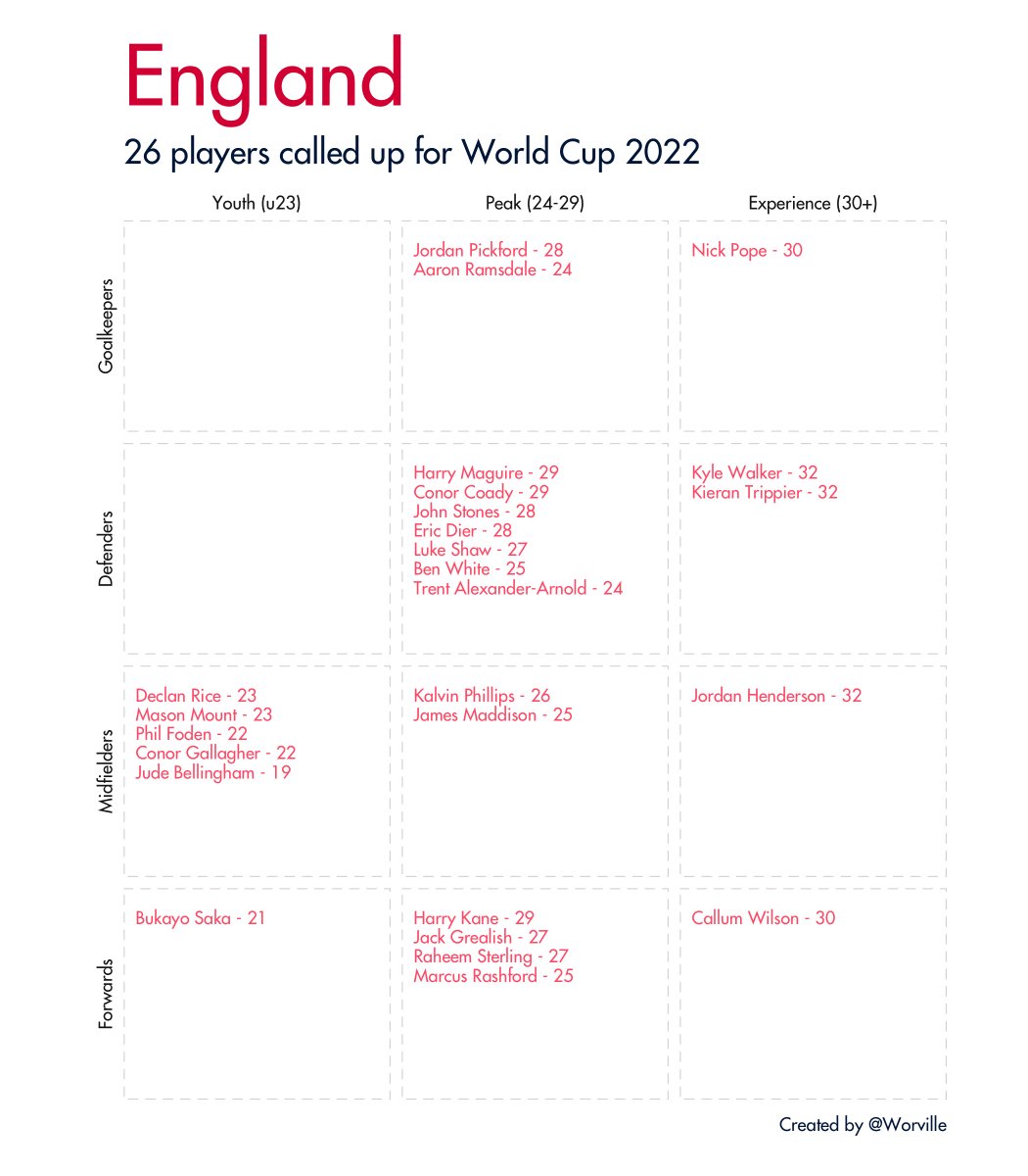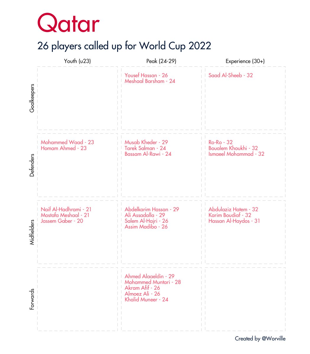 Quick 🧵 of all 32 #WorldCup2022 squads broken down by age and position. Data taken from Wikipedia.