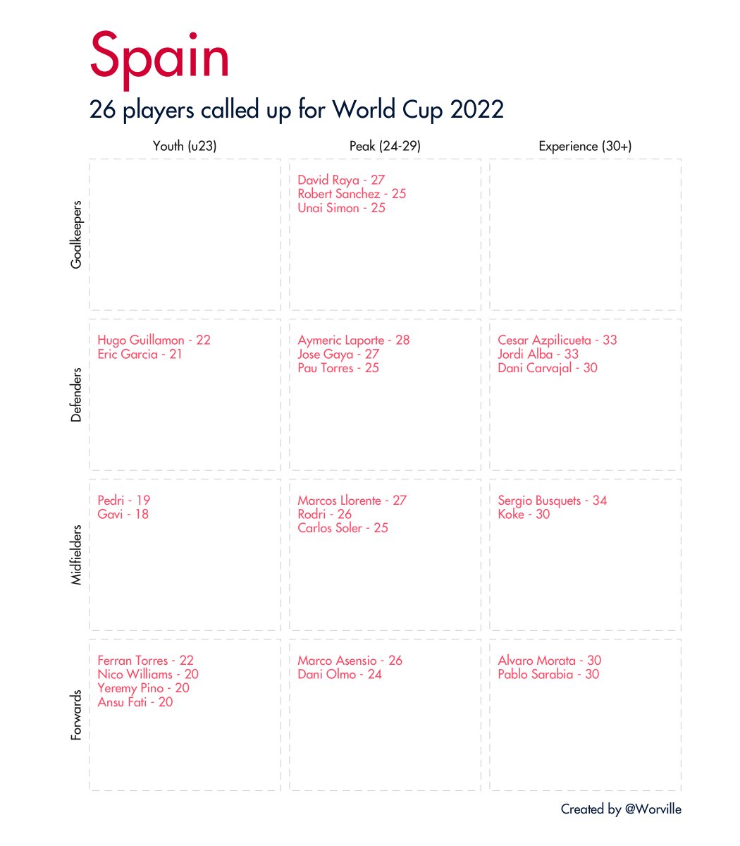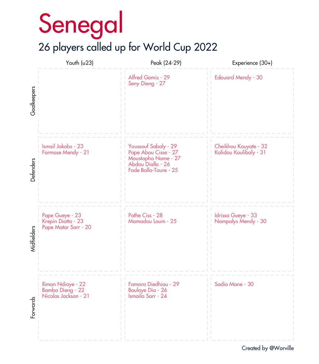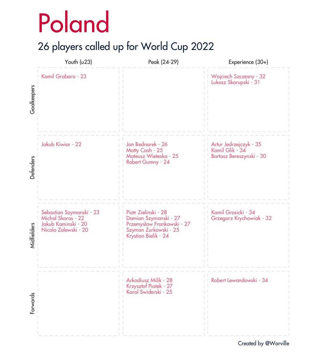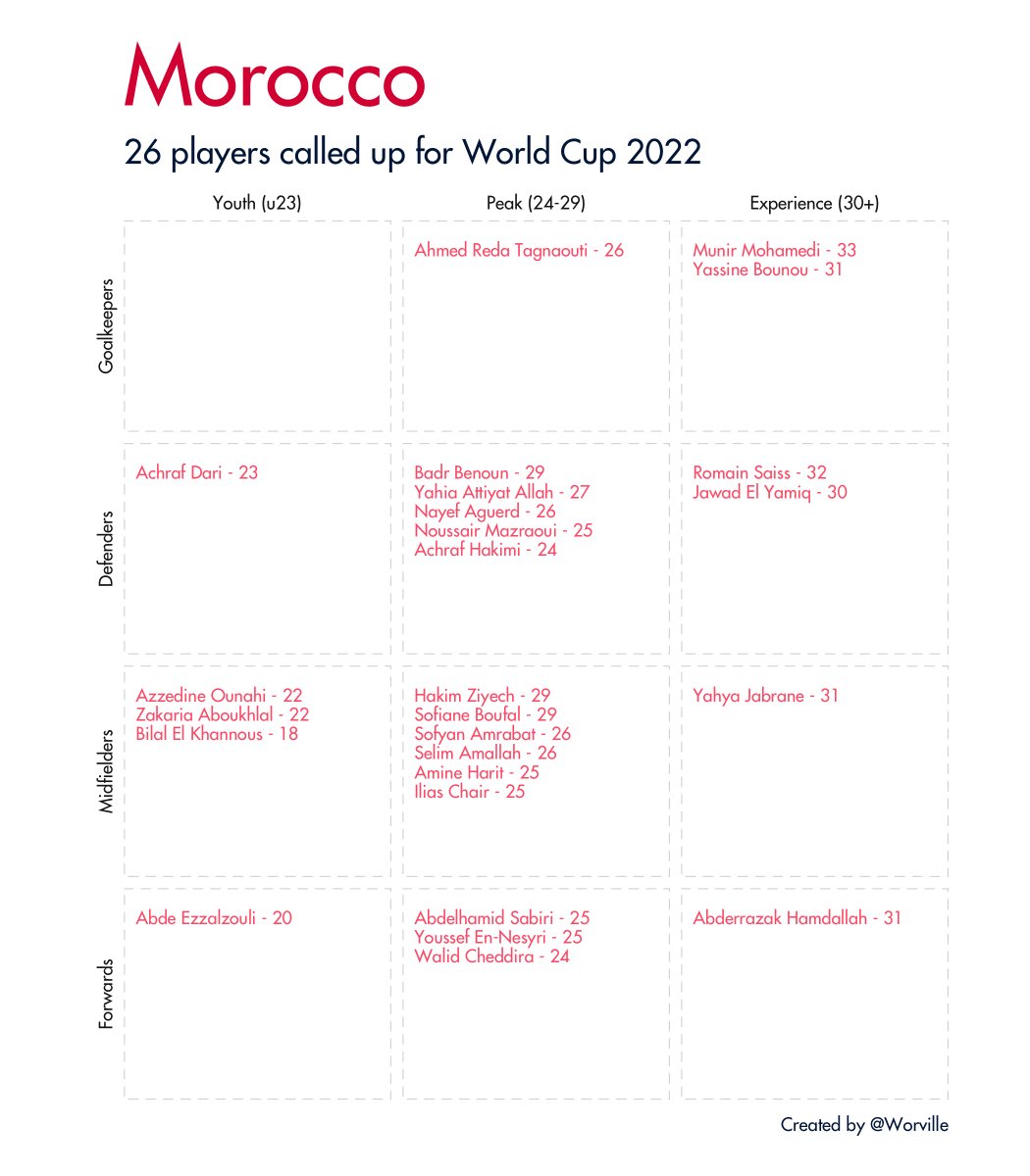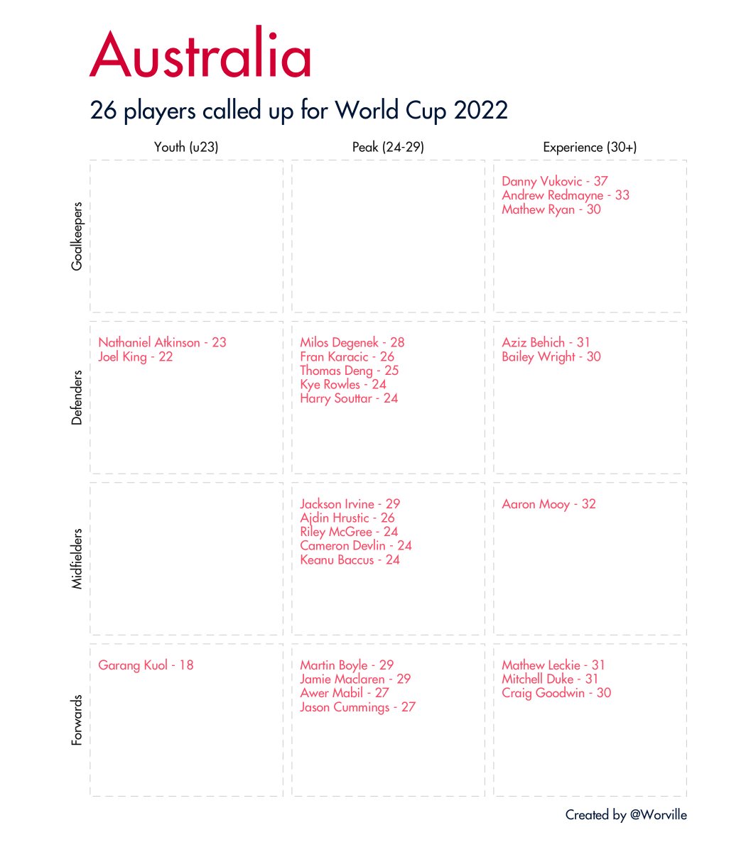 Quick 🧵 of all 32 #WorldCup2022 squads broken down by age and position. Data taken from Wikipedia.