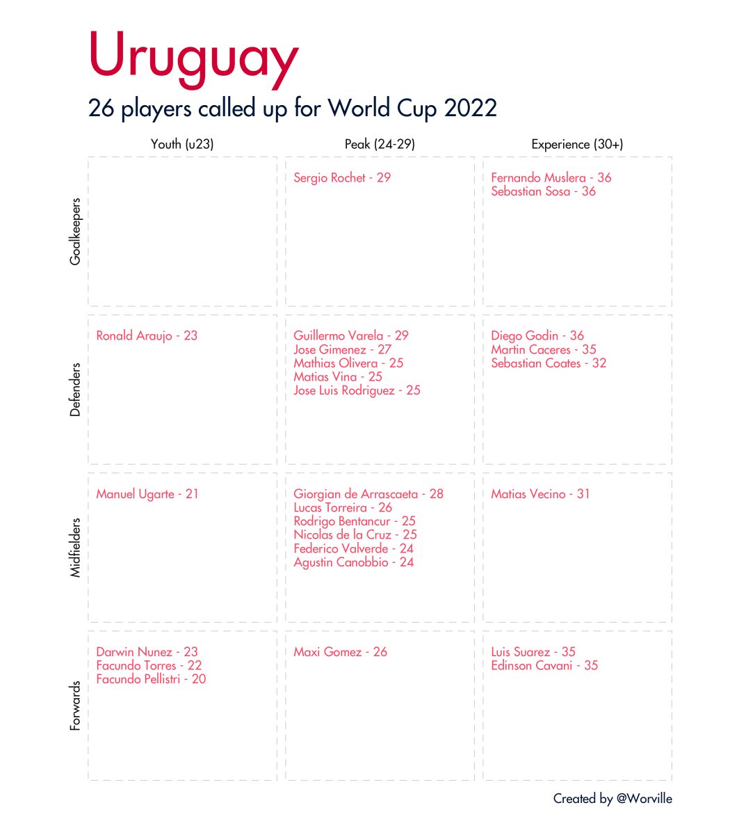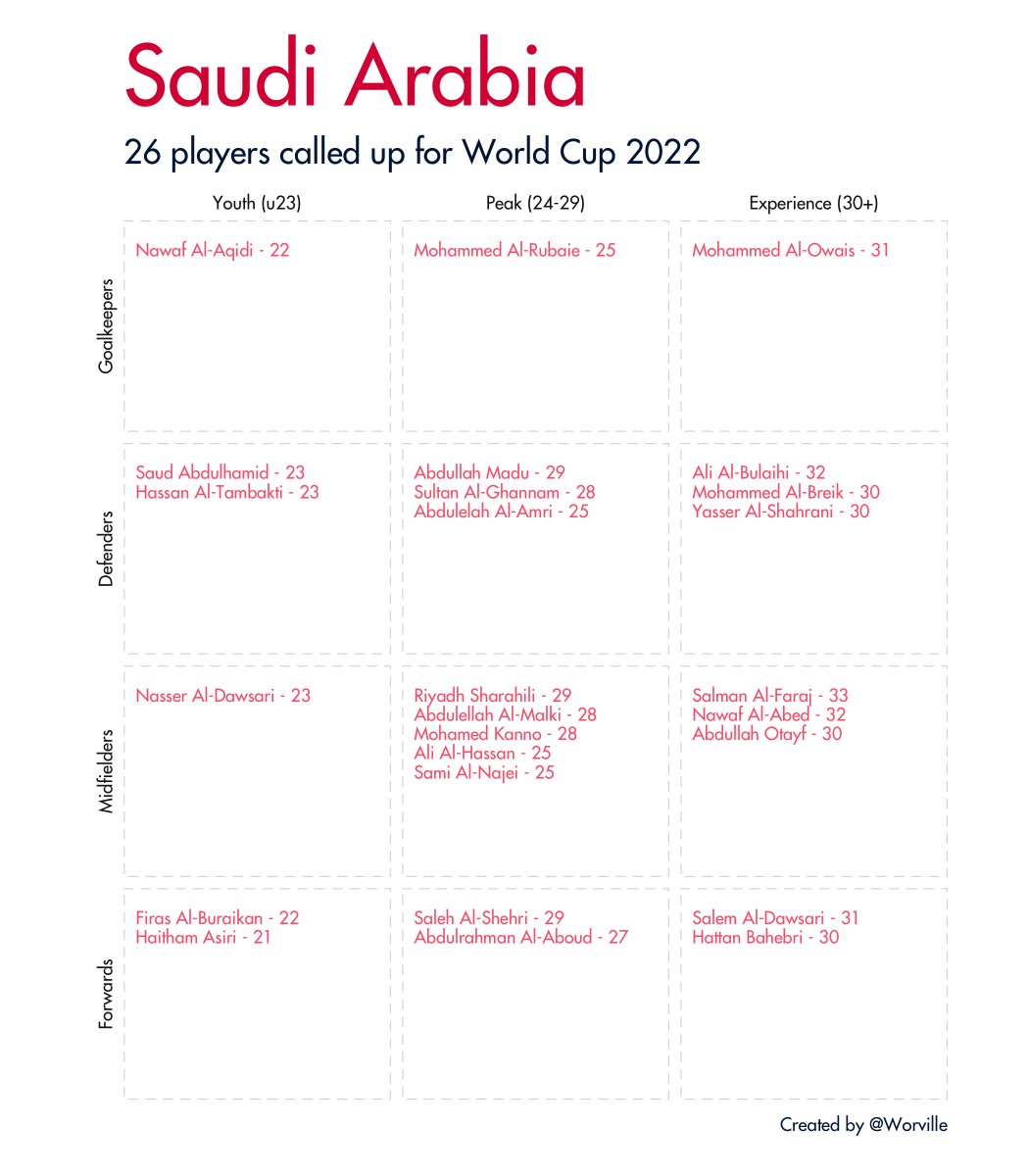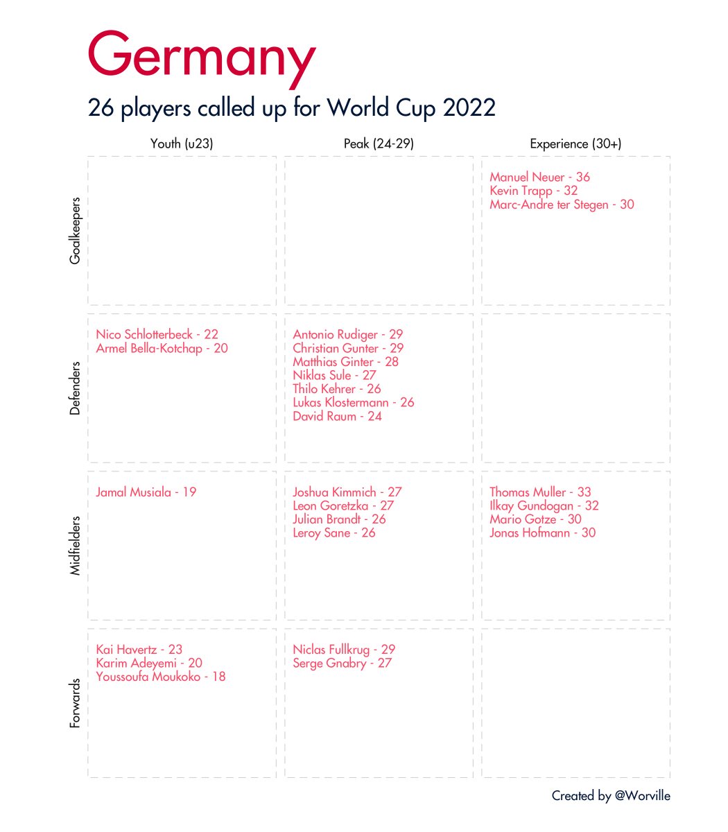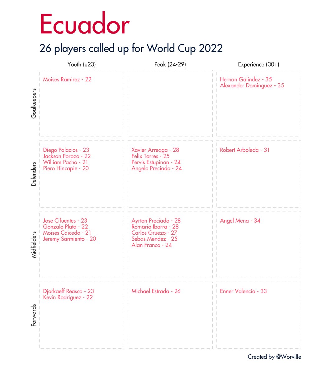 Quick 🧵 of all 32 #WorldCup2022 squads broken down by age and position. Data taken from Wikipedia.