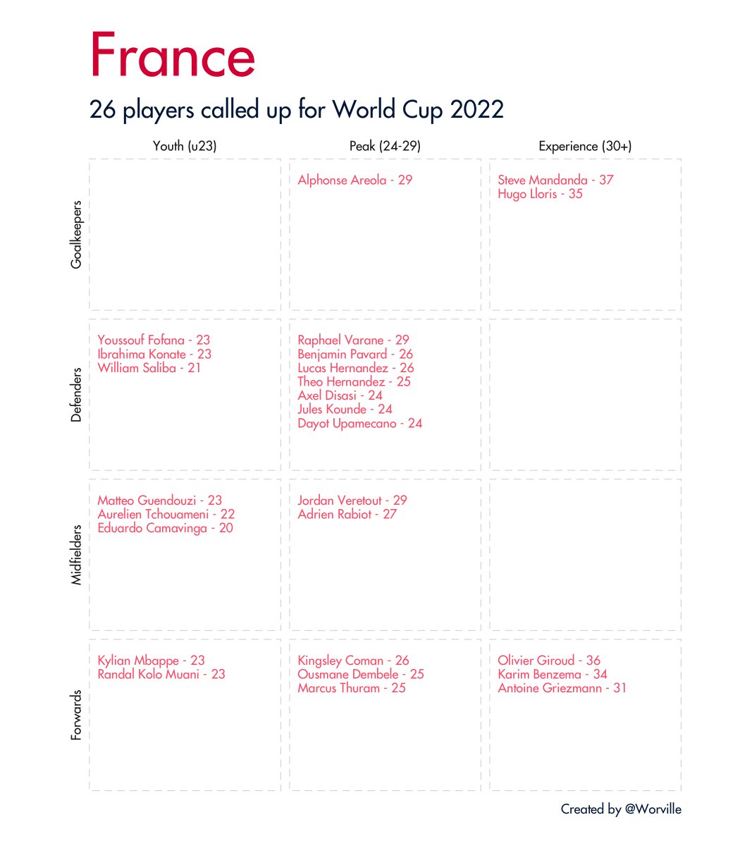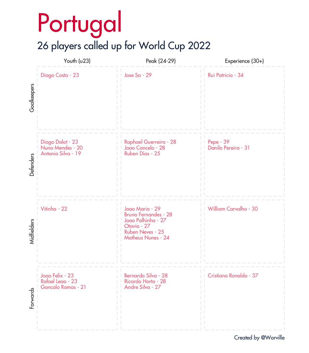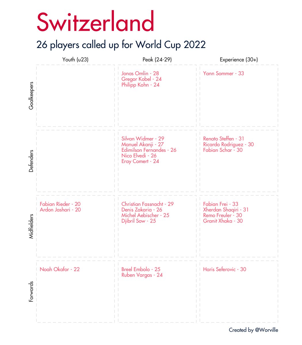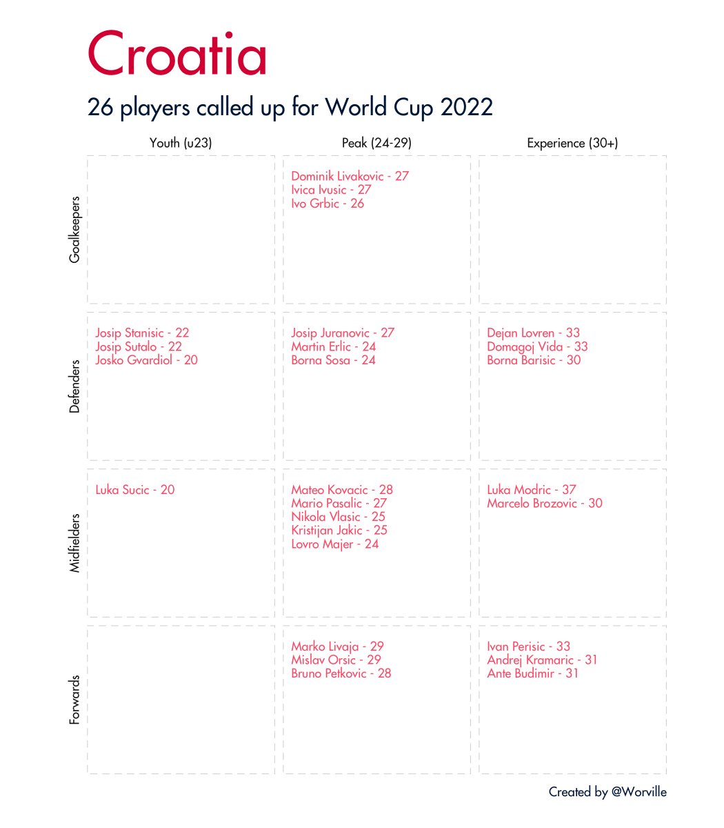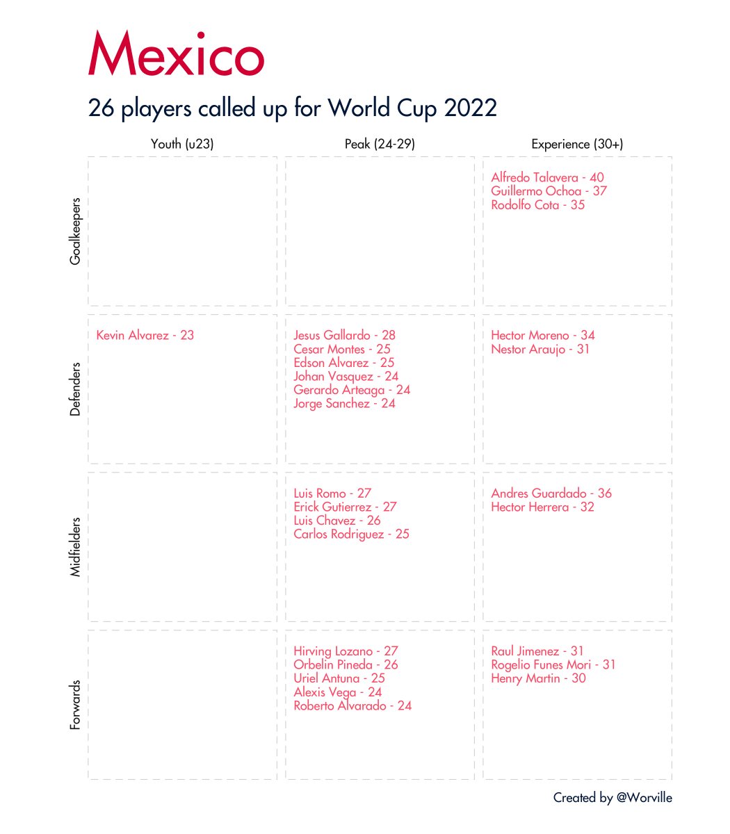 Quick 🧵 of all 32 #WorldCup2022 squads broken down by age and position. Data taken from Wikipedia.