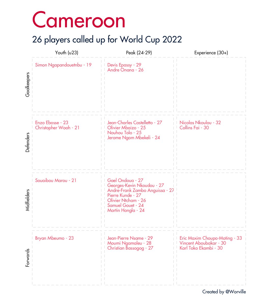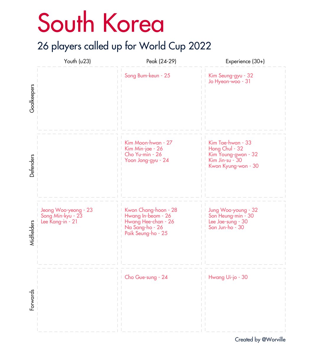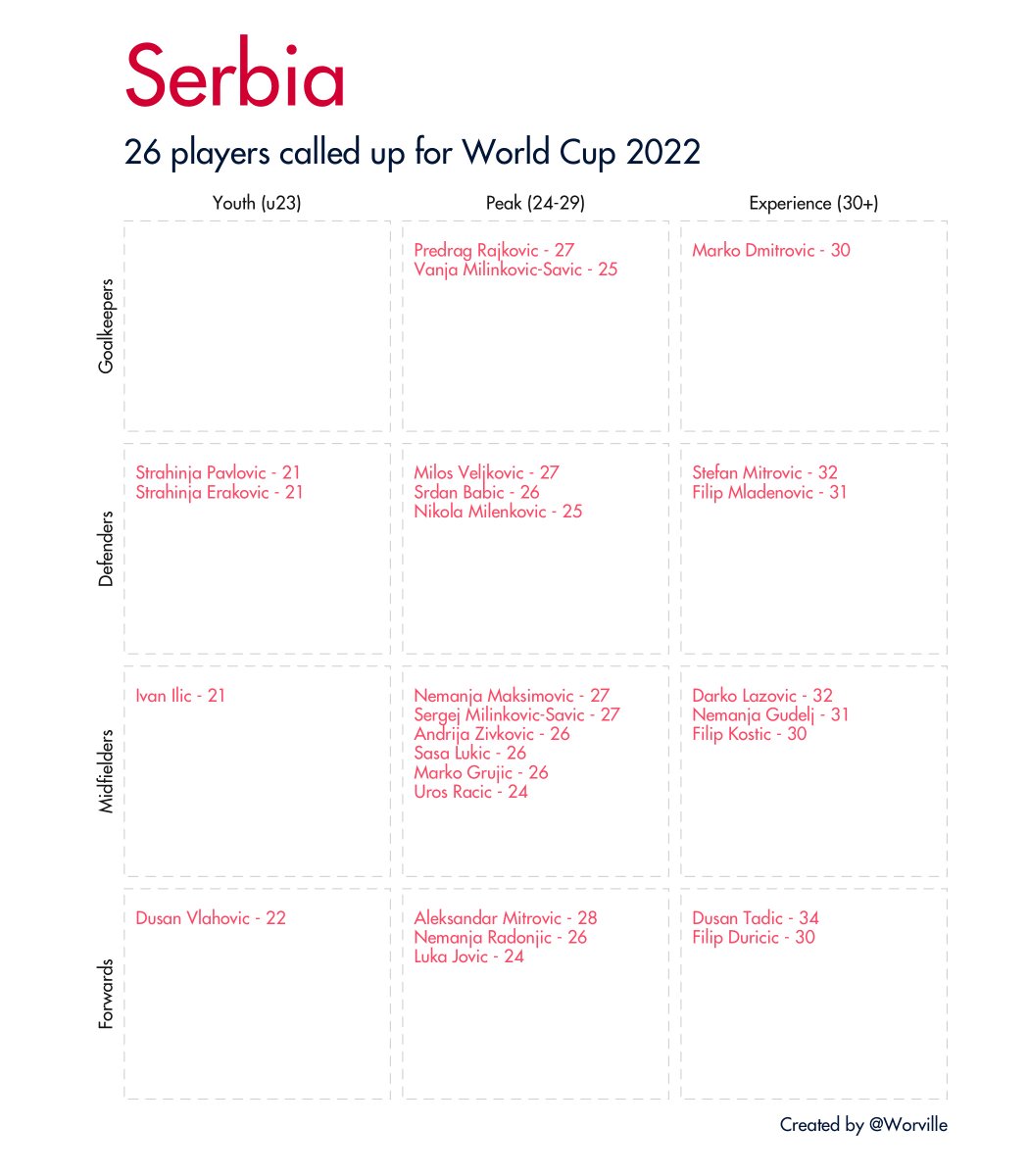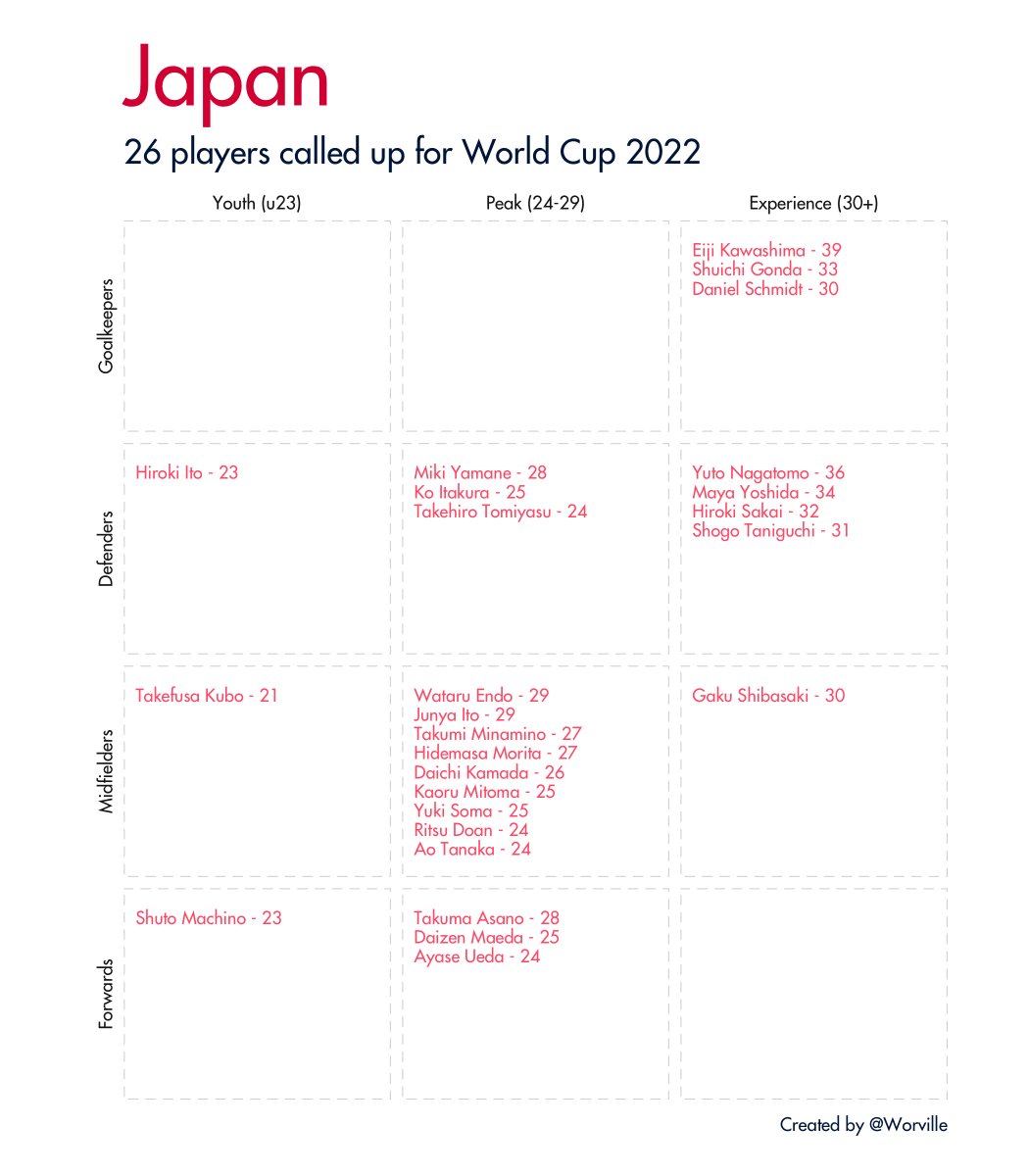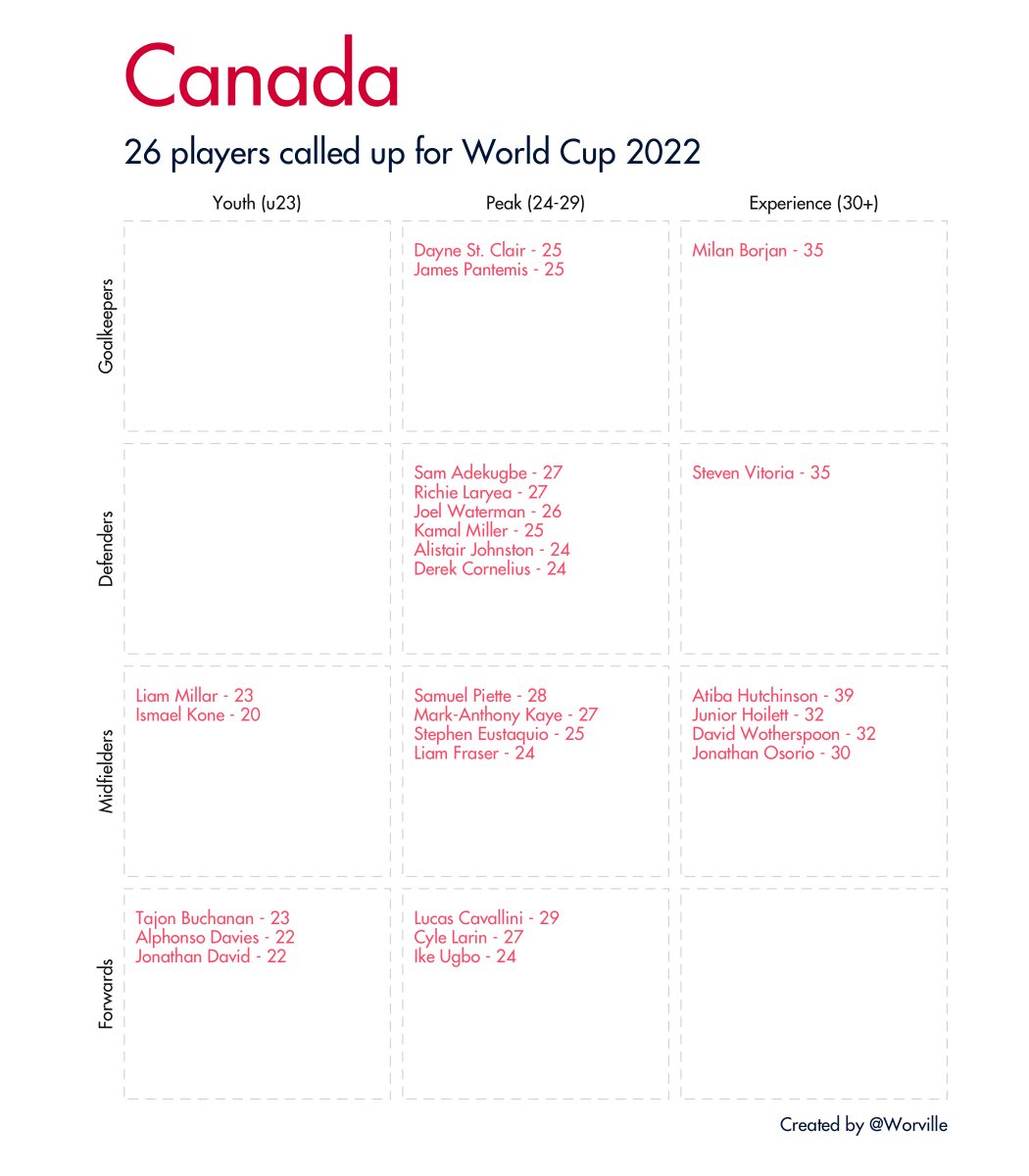 Quick 🧵 of all 32 #WorldCup2022 squads broken down by age and position. Data taken from Wikipedia.
