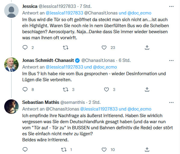 Dass @ChanasitJonas behauptet habe, nur OP-Masken könnten von "Laien" korrekt getragen werden, FFP2-Masken hingegen nicht, hat der Arbovirologe mir gegenüber diese Woche vehement bestritten und sogar mit dem Kadi gedroht.