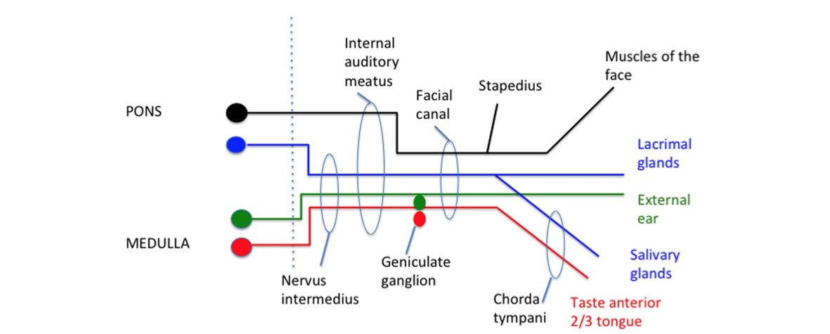 Groen is de zenuw die het gevoel van het oor verzorgd, en rood is de zenuw die de smaak van het voorste 2/3 deel van tong verzorgd.