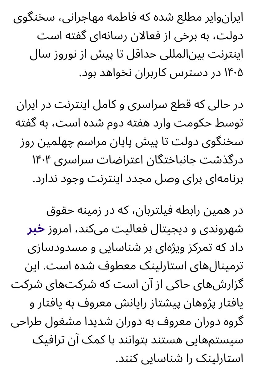 2- It is expected that the disconnection of the Iranian people's digital communications with the outside world will continue for months with degrees more or less similar to now. Starlink internet is the only source of leaking information, images, text, and voice reports.