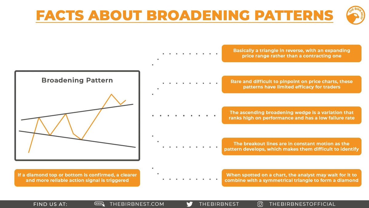 Broadening Wedge - more than 75% of the time, the breakout occurs in the direction from where price enters the formation.