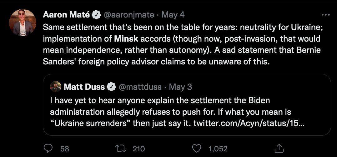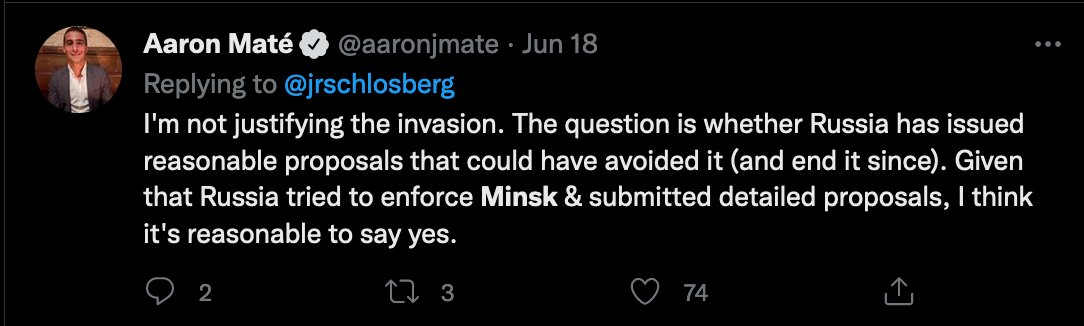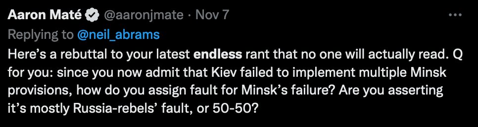 @aaronjmate For the most part, Maté’s ignored me. Only after I started making fun of him for that did he finally respond. It was the thread above, on Minsk, which he chose to reply to, thus commencing our recent exchange.