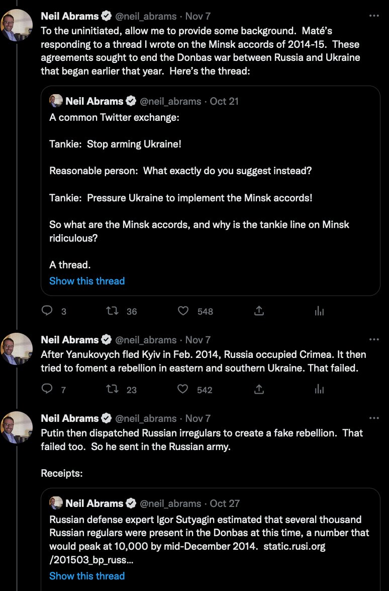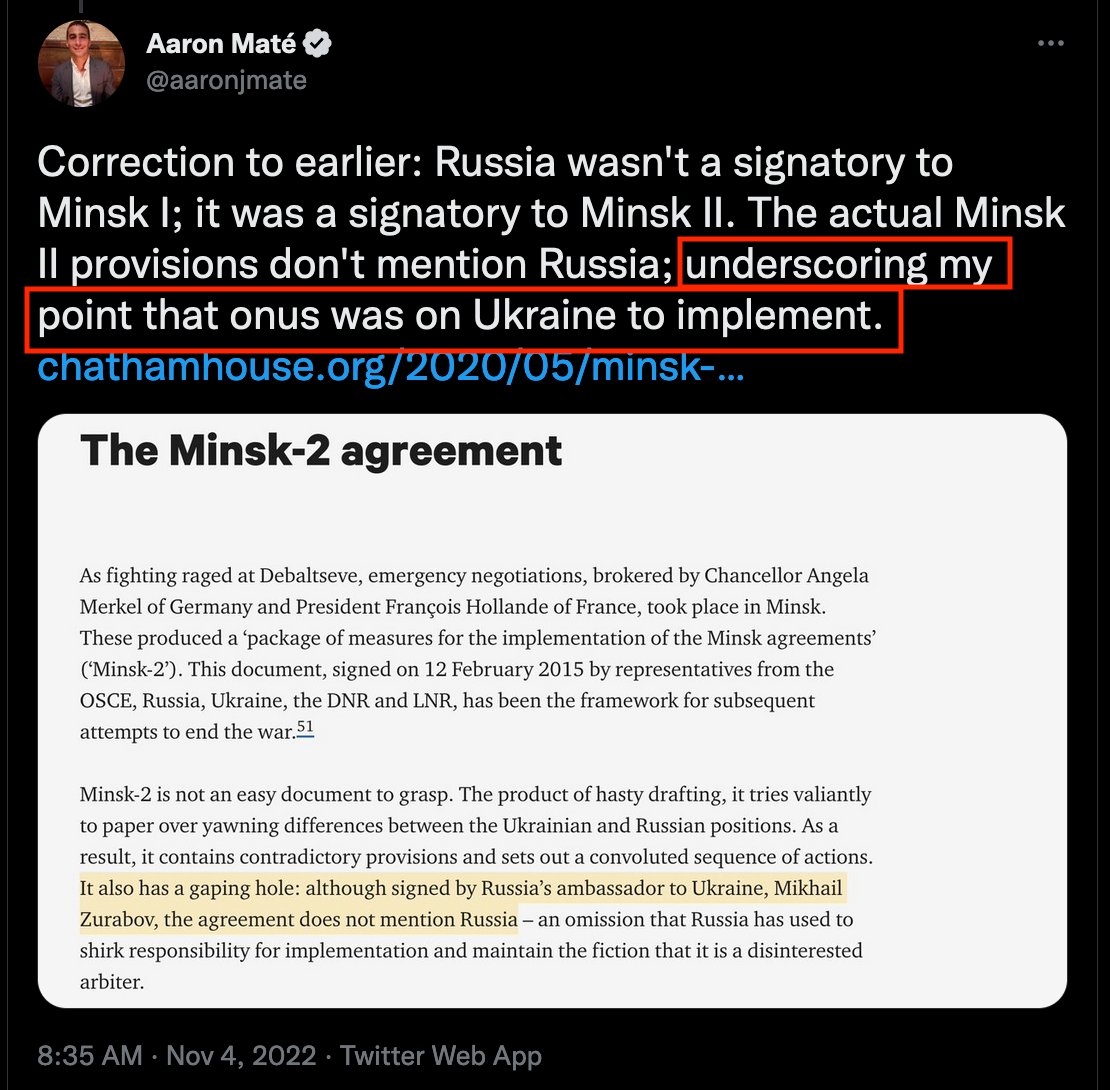 @aaronjmate What I intend to demonstrate here is not the staggering deficiencies in Maté’s factual understanding of the war but rather the basic dishonesty that informs his entire Ukraine shtick, as illustrated by his position on the Minsk accords.
