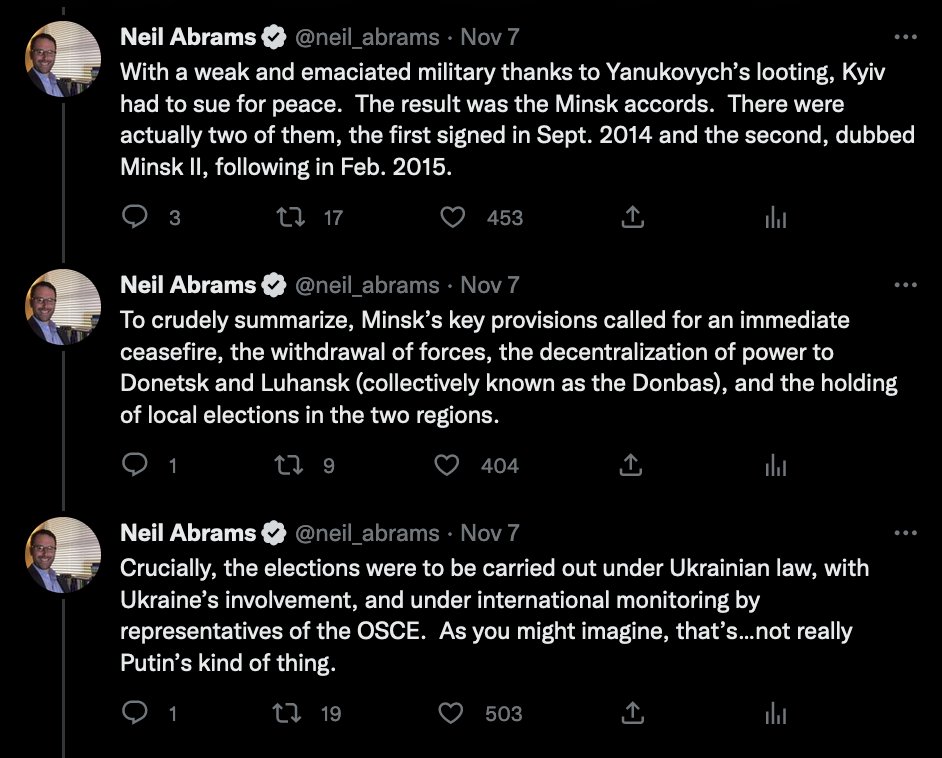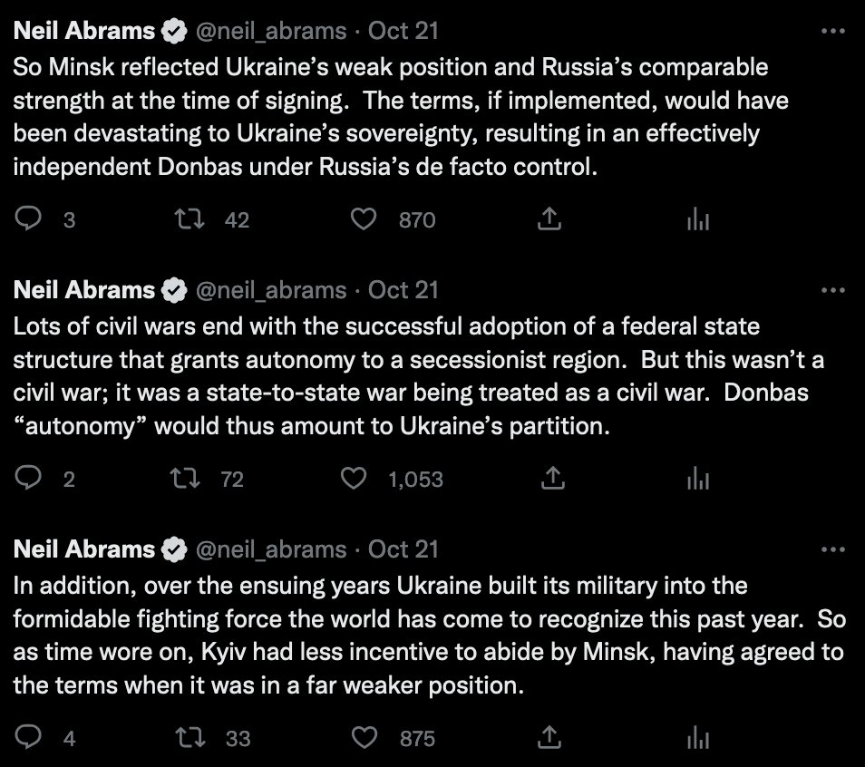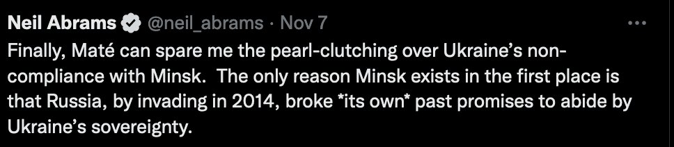 @aaronjmate Second, even if Ukraine were solely to blame, it is under no moral obligation to comply. The only reason Minsk exists in the first place is that Russia, by invading Ukraine in 2014, broke its own past pledges to respect Ukraine’s territorial sovereignty.