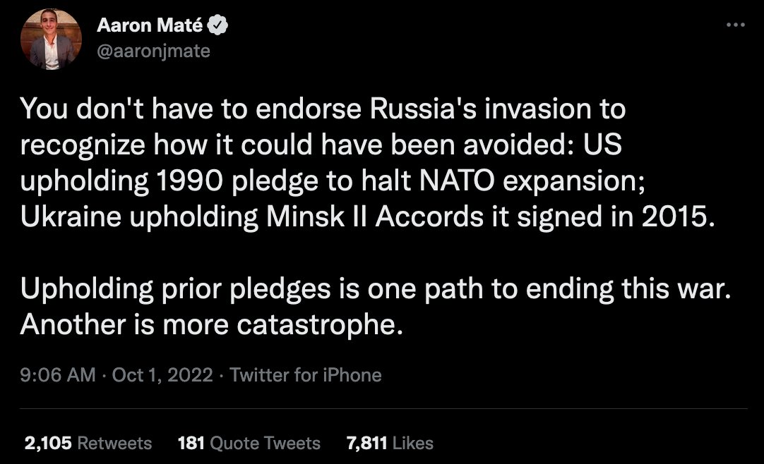 @aaronjmate Since Russia’s February invasion, Maté’s animating purpose has been to shift the blame for the war onto others. Among the devices he draws upon in this pursuit are the Minsk accords. “If only Ukraine had abided by Minsk,” he claims, “this whole situation could have been avoided.”