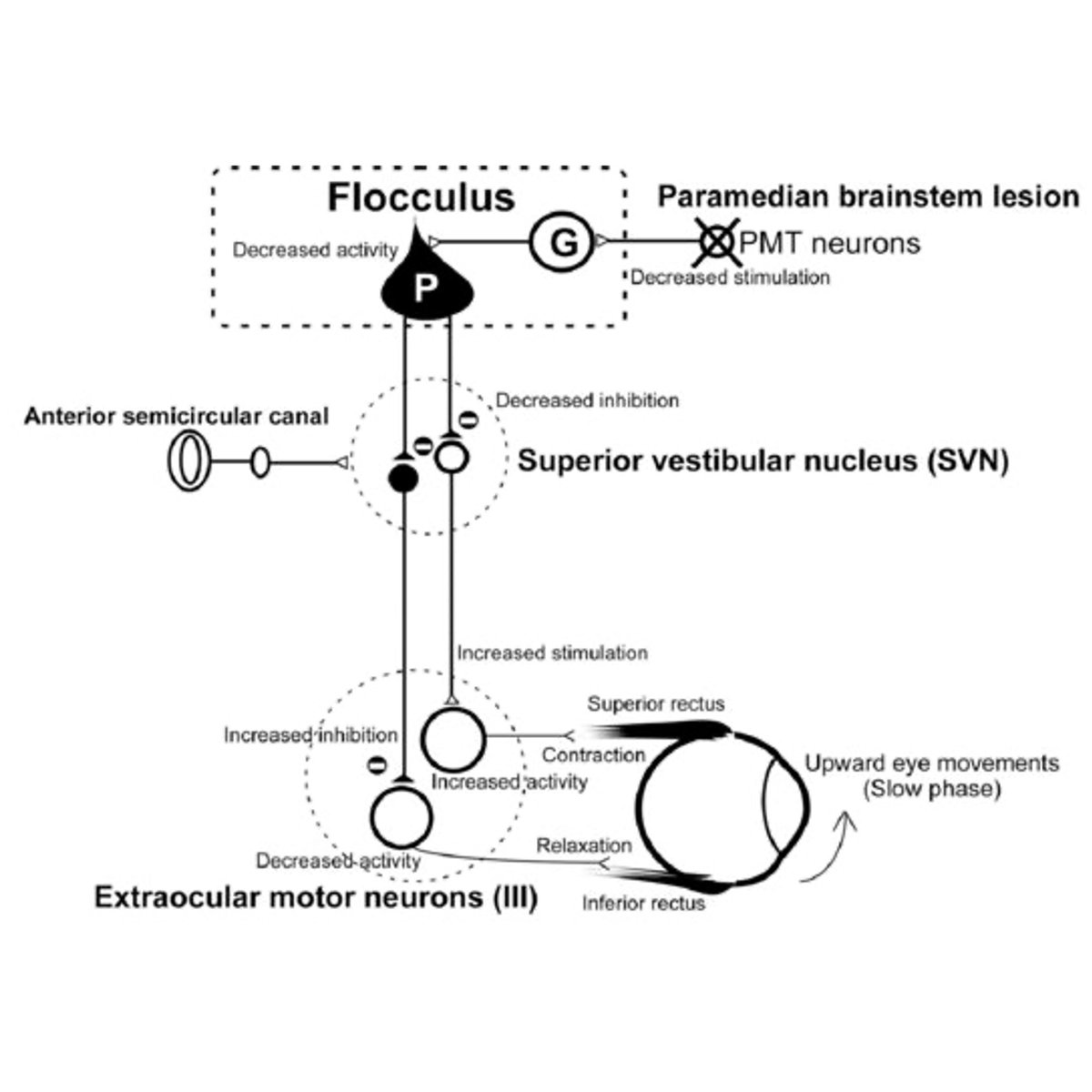 d) downbeat nystagmus greatest on up gaze; vertical gaze-holding impair