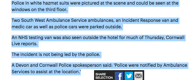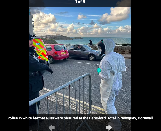 A team of biohazard suits and police have been seen at a hotel in Cornwall this afternoon for a medical emergency in which one person was taken to hospital...