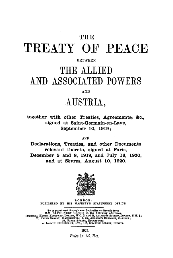 Legally, the collapse of the empire was formalized in the September 1919 Treaty of Saint-Germain-en-Laye with Austria, which also acted as a peace treaty after the First World War, and in the June 1920 Treaty of Trianon with Hungary.