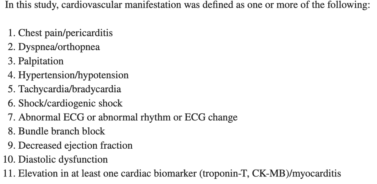The definition of ❤️ manifestation included the following. 7 patients were found to have abnormal lab markers but a few more had symptoms, leading to the quoted percentage of cardiovascular manifestations. These would be "probable myocarditis" per case definitions. (5/10)