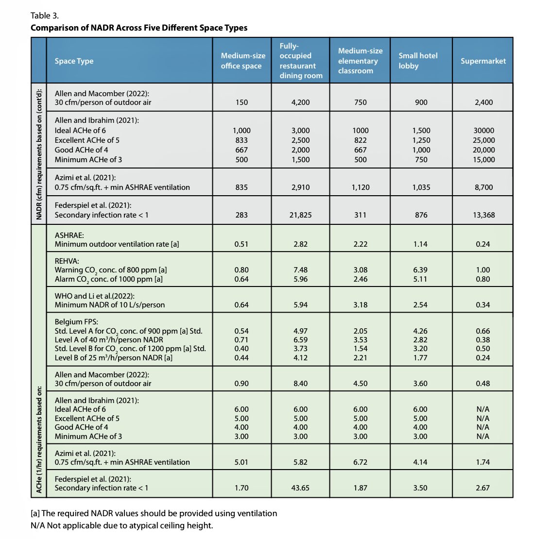 werden drei der gebräuchlichsten Belüftungskennzahlen - Luftwechsel pro Stunde, Volumenstrom pro Person und Volumenstrom pro Bodenfläche - untersucht und neue Zielwerte für die nicht-infektiöse Luftzufuhr (NADR) vorgeschlagen, die über die derzeitigen Mindeststandards