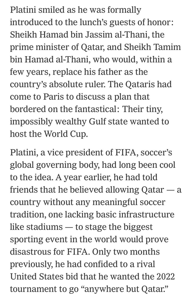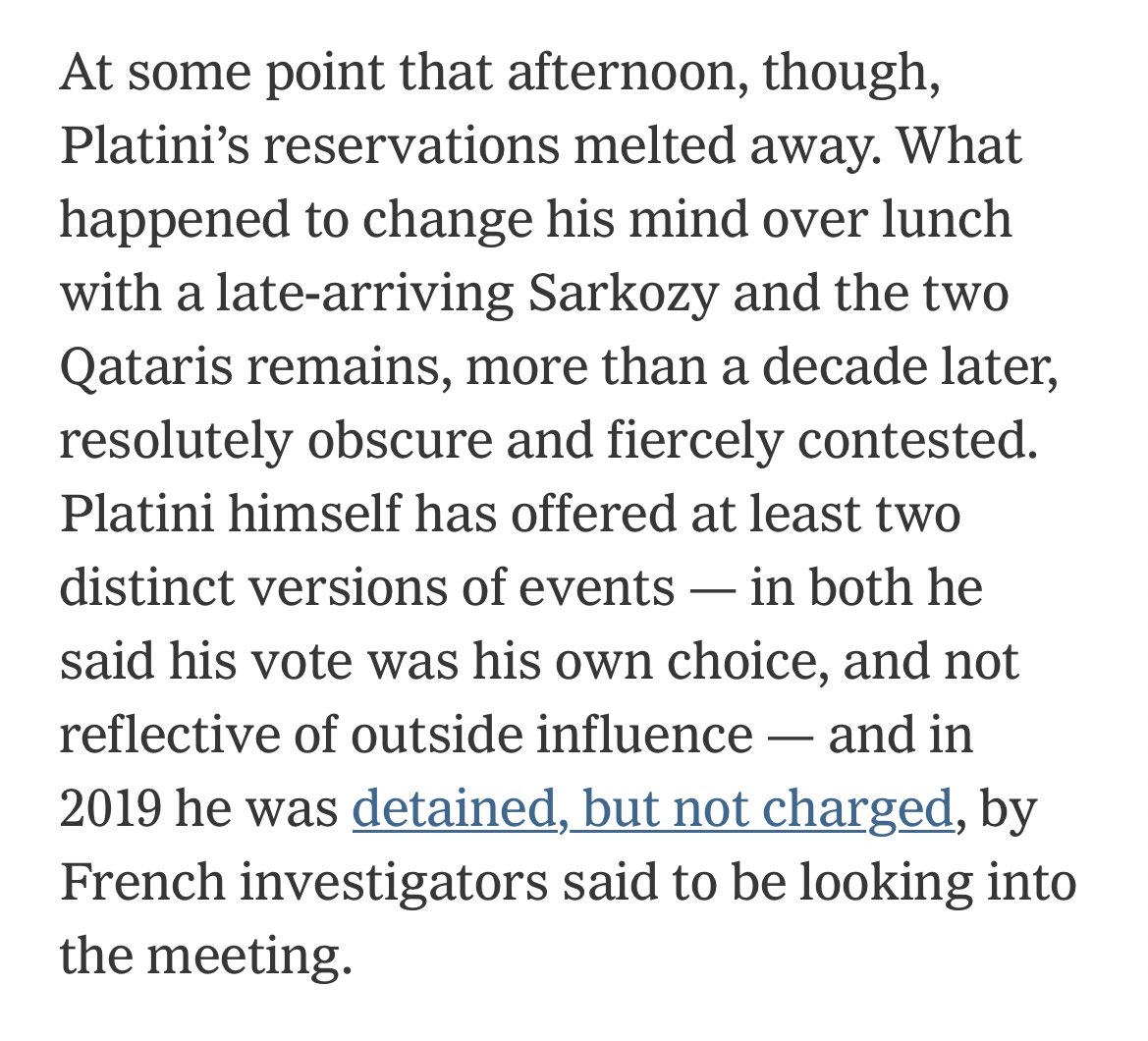 “At some point that afternoon, though, Platini’s reservations melted away. What happened to change his mind over lunch with a late-arriving Sarkozy and the two Qataris remains, more than a decade later, resolutely obscure and fiercely contested”