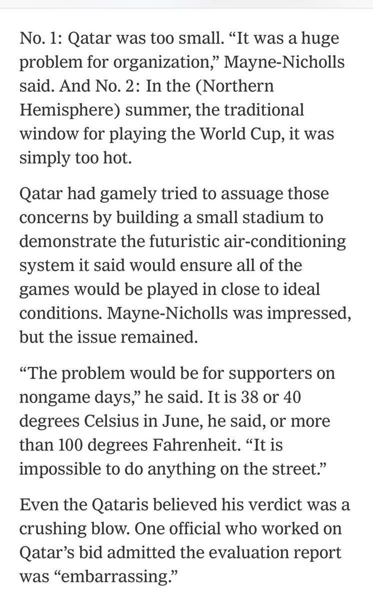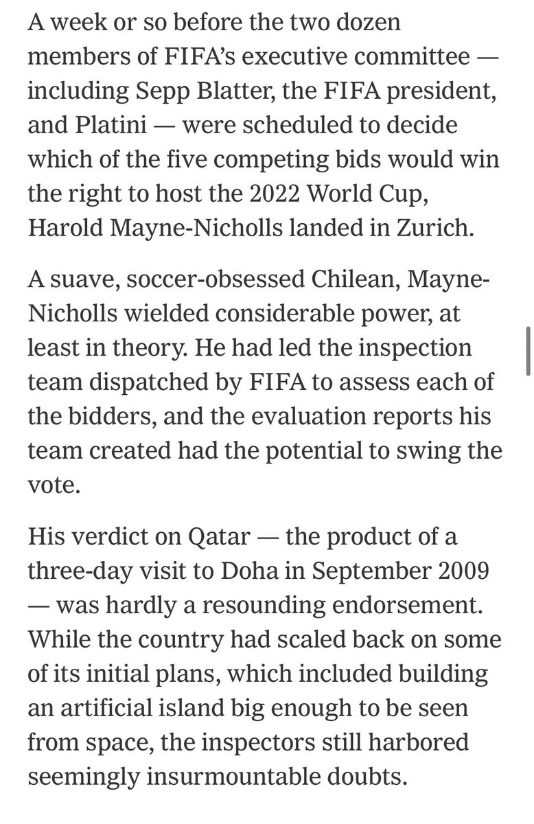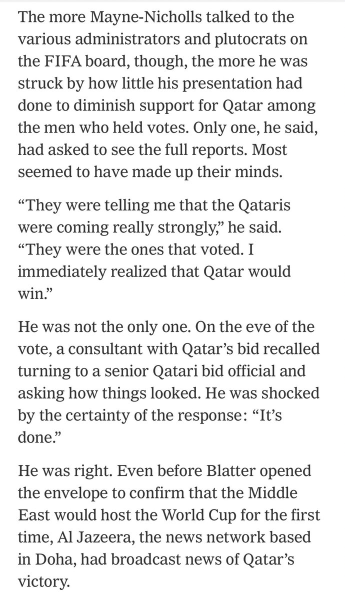“Even the Qataris believed his verdict was a crushing blow. One official who worked on Qatar’s bid admitted the evaluation report was “embarrassing.”
