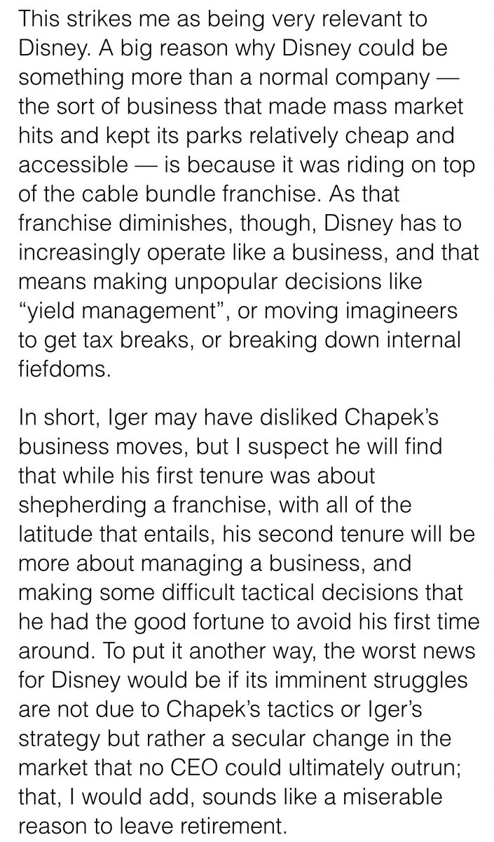 “To put all of this a different way, if Iger is coming back because he disagrees with Chapek’s tactics, well, that strikes me as a bad idea: Chapek played the hand that was dealt him by Bob Iger.”