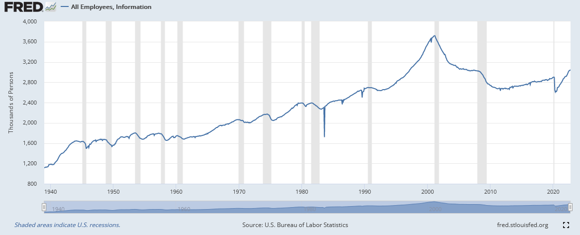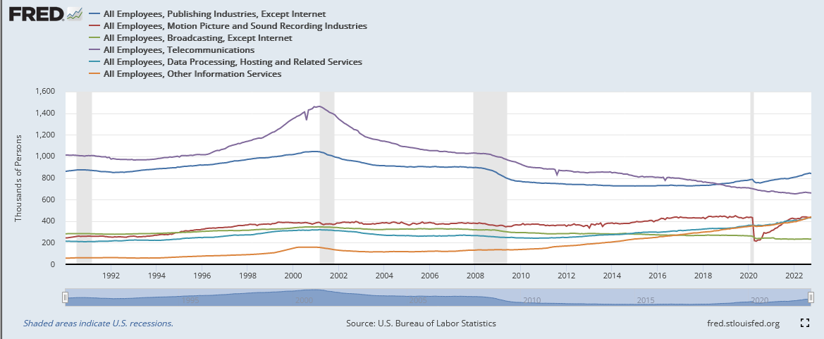 Ok, so this is a useless classification and has no bearing on employment in tech. The decline is from telecomm and publishing. And this doesn't appear to have much if any "tech" in it tbh. h/t @pearkes