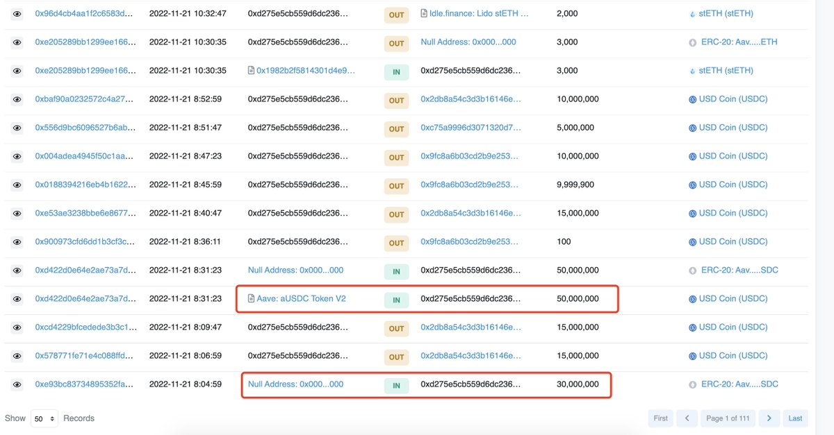 On November 21, 0xd275 borrowed 80M $USDC from #Aave and transferred to the exchanges.