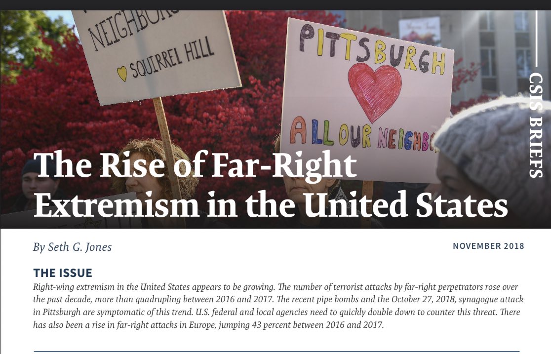 Per a Nov. 2018 report by the Center for Strategic and International Studies, the number of far-right terrorist attacks in the US more than quadrupled between 2016 and 2017.