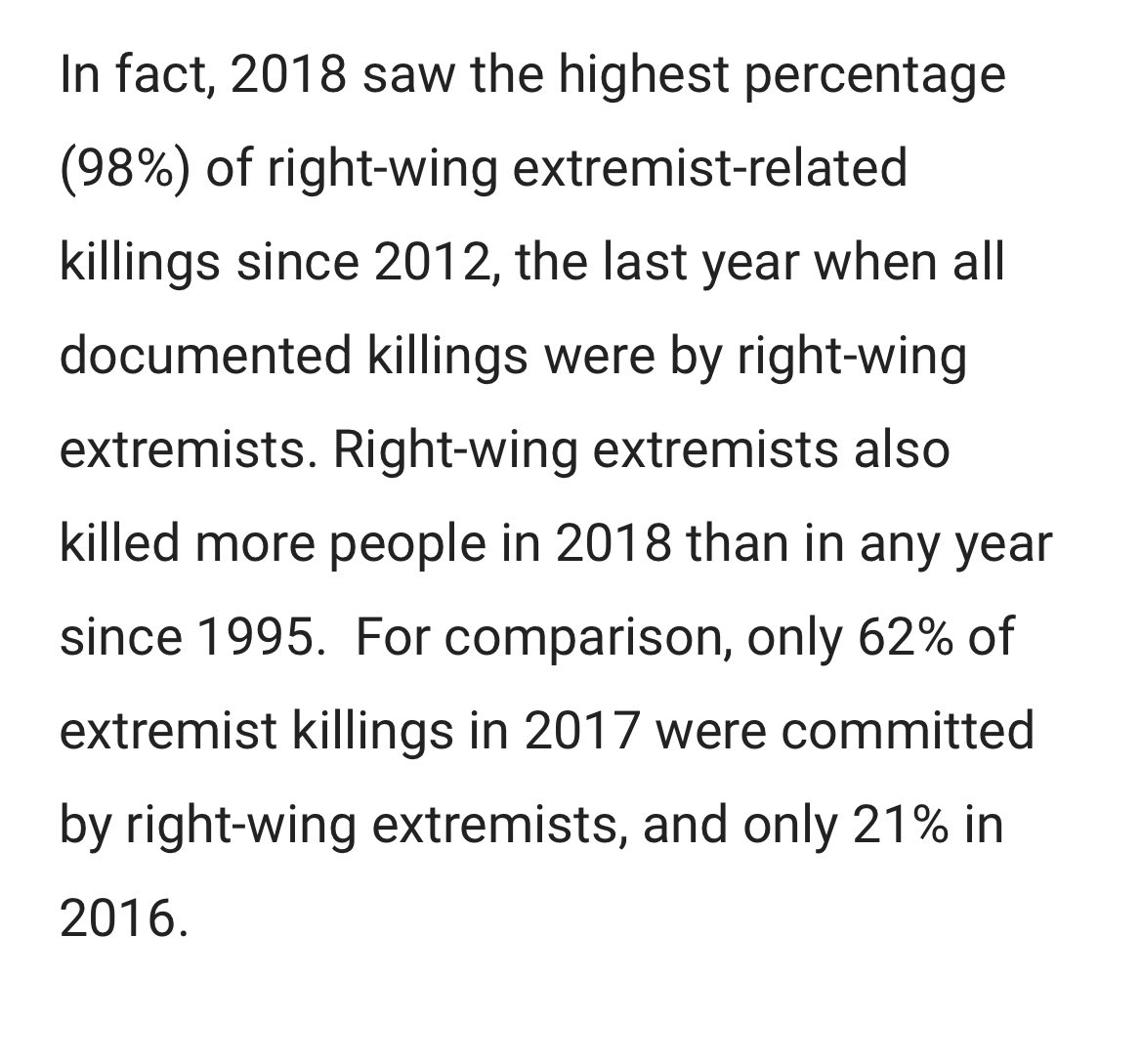 Another analysis found that every single one of the 50 extremist murders documented in 2018 was committed by a person or persons with ties to right-wing extremism. Right-wing extremists killed more people in 2018 than in any year since 1995. adl.org/murderandextre…