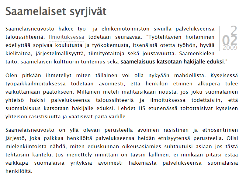 Ai kuka tämä saamelaisia vieroksunut kirjoittaja oli? No mistäpä minä sen voisin tietää. Mutta ehkäpä jotain vinkkejä blogista voi lukea. Viehtymys lievästi sanoen arkaaisiin metsästysmuotoihin, kuten kettujen pyytämiseen jalkanaruilla, pisti silmään jo silloin.