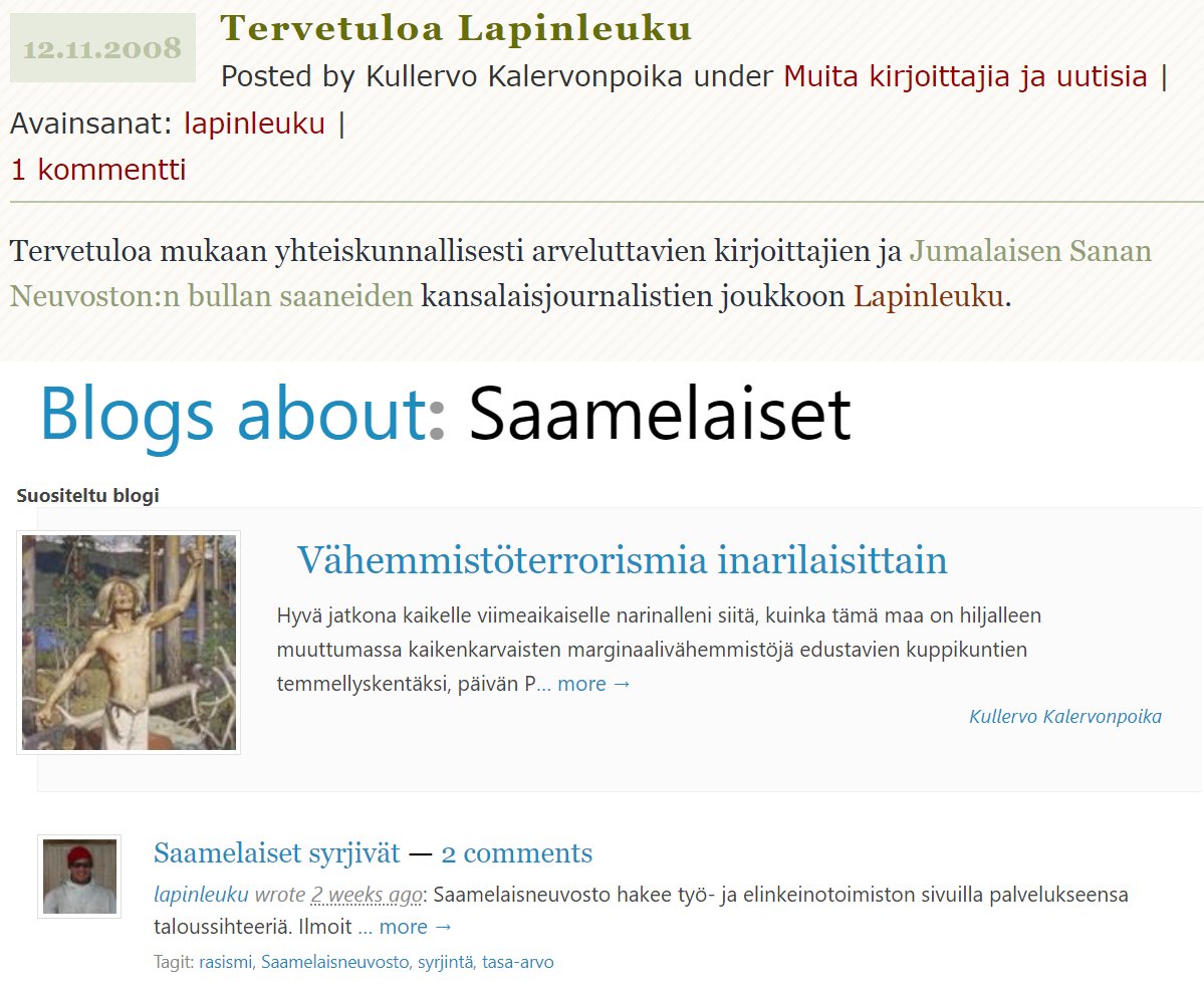"Lapinleuku" oli jäänyt monista sekalaisista halla-aholaisista blogeista mieleeni lähinnä siksi, koska sen kirjoittajalla tuntui tavanomaisen perussisällön ohella olevan muusta kämyilystä hieman poikennut erityisen ristiriitainen asenne maamme pohjoiseen alkuperäiskansaan.