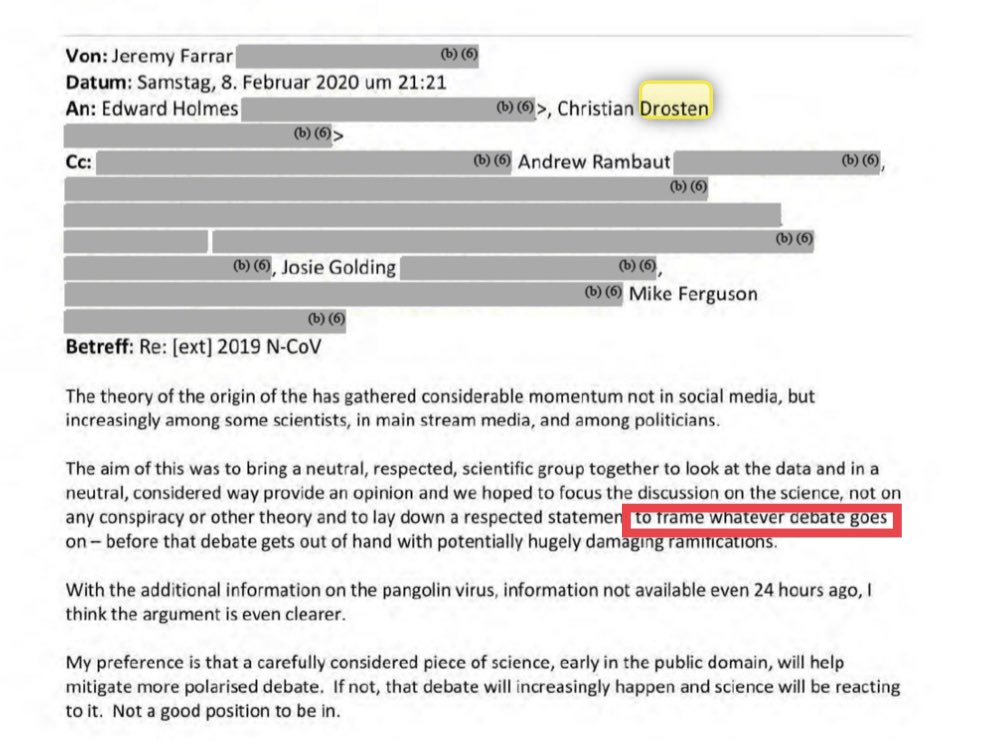 Der Sound in der Konversation dieser kleinen Virologen-Clique ist schon sehr befremdlich und konspirativ. Sie dreht sich fast durchgehend darum, wie man die Debatte durch eine frühe Veröffentlichung so „framen“ könne, dass keine „polarisierende“ #Lableak-Debatte losbricht