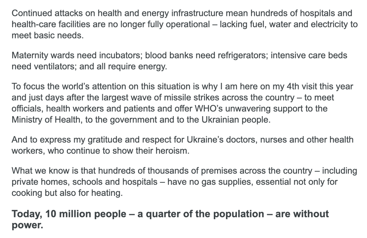 1/13 Immagino che molti abbiano sentito le notizie che arrivano dall'ultima visita del direttore dell'#OMS Hans Kluge a #Kyiv. Si parla di emergenza freddo per milioni di persone a cui è precluso l'accesso all'energia elettrica, acqua e riscaldamento. Lo considero eufemismo.