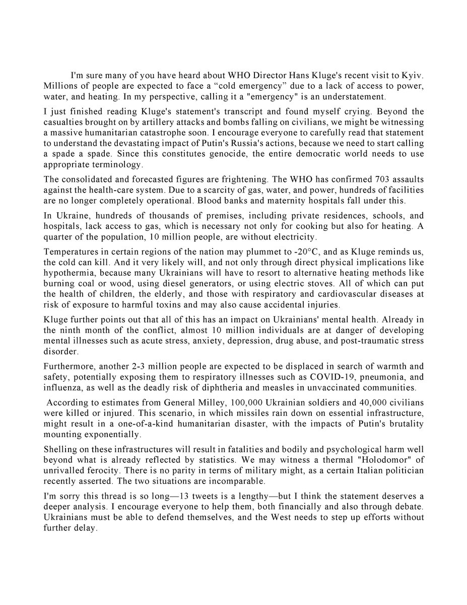12/13 Potremmo assistere a un «Holodomor» termico, psicologico, di una crudeltà rara. Non hanno raggiunto alcuna simmetria sul campo, come qualcuno in Italia suggerisce, perché sulla #Russia non piovono missili. Non sono paragonabili le due condizioni. Mi scuso per la lungaggine.