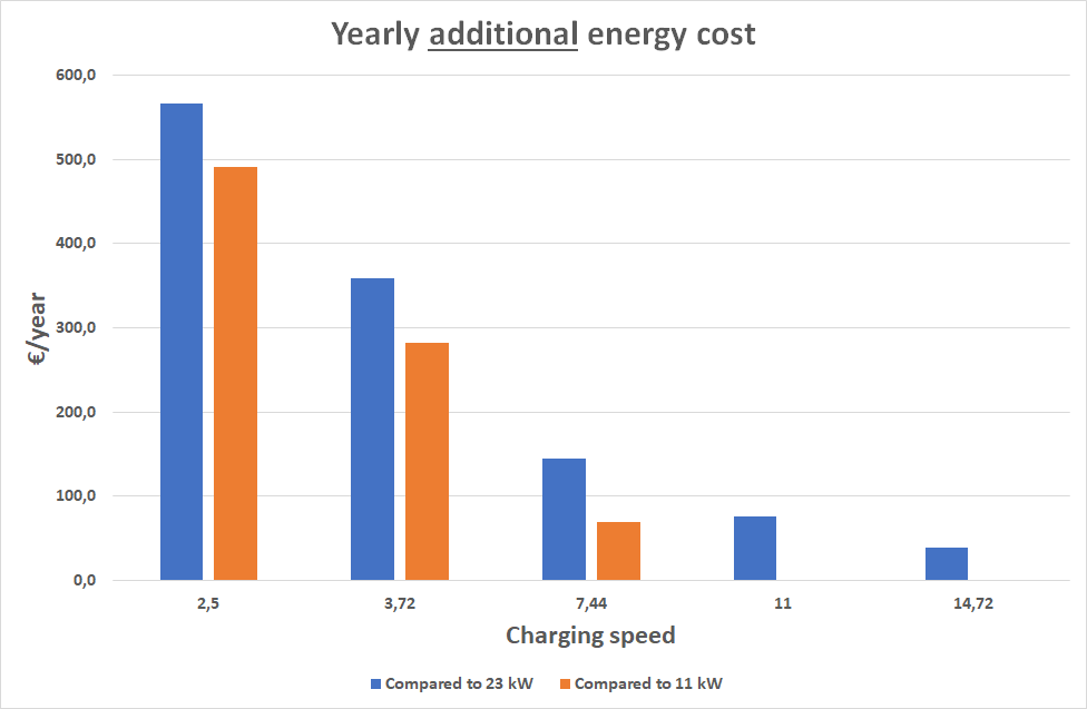Opladen aan minimumsnelheid van 2,5kW verbruikt jaarlijks maar liefst 756kWh meer energie dan aan maximumsnelheid van 23kW, aan €0,75/kWh goed voor €567 jaarlijkse meerkost. Maar ook realistischer cases van 3,7 en 7,4 tegenover 11kW is nog goed voor tot €283 meerverbruik. 5/