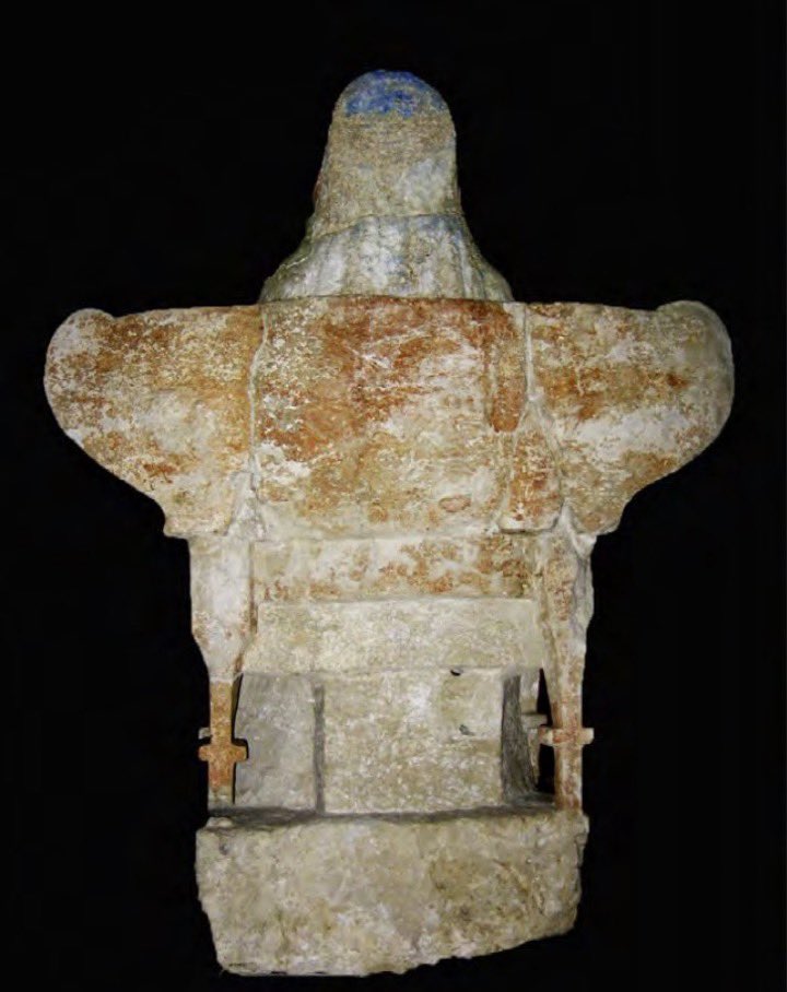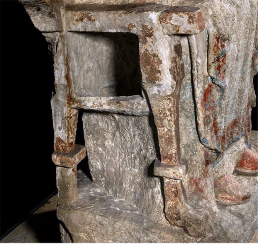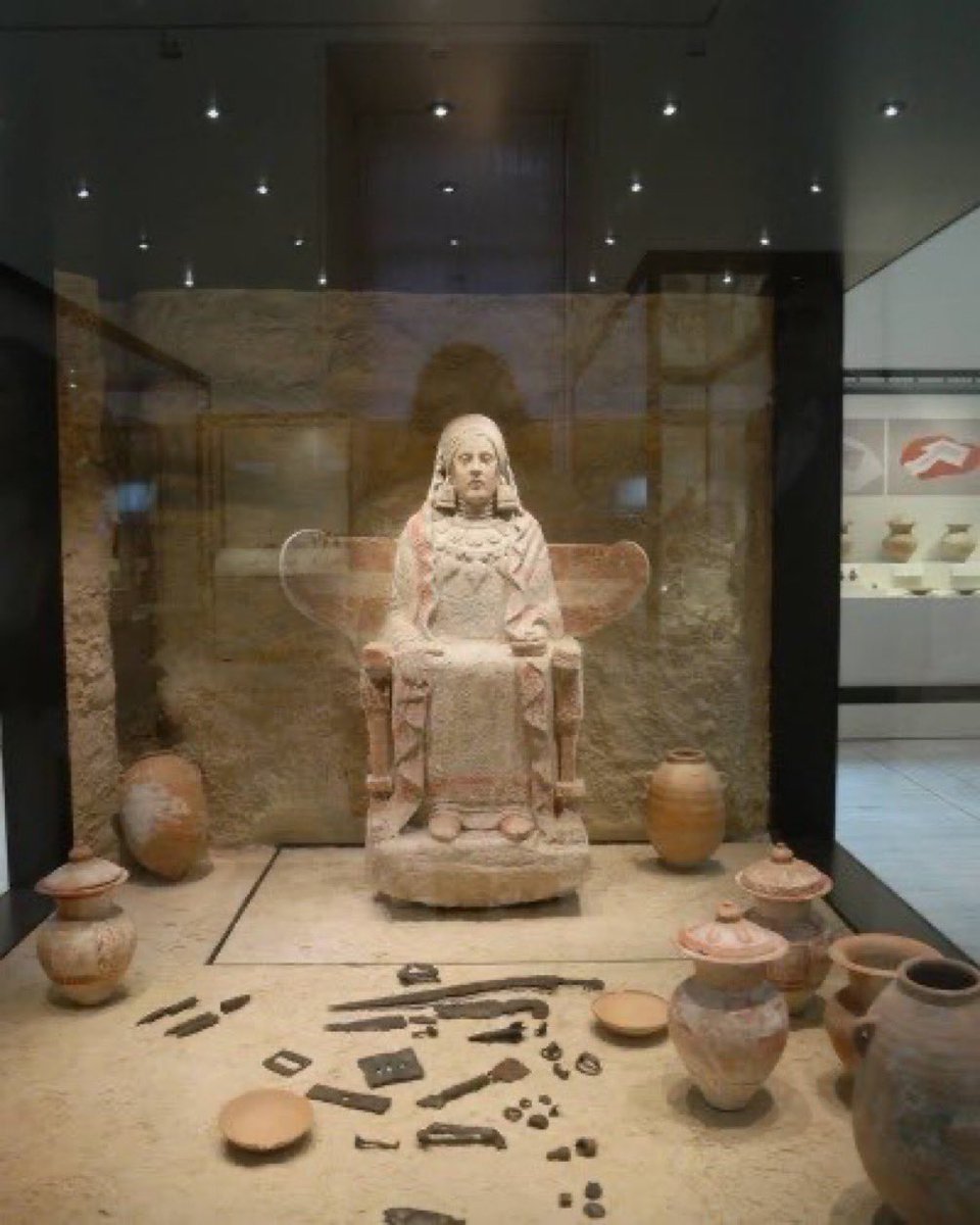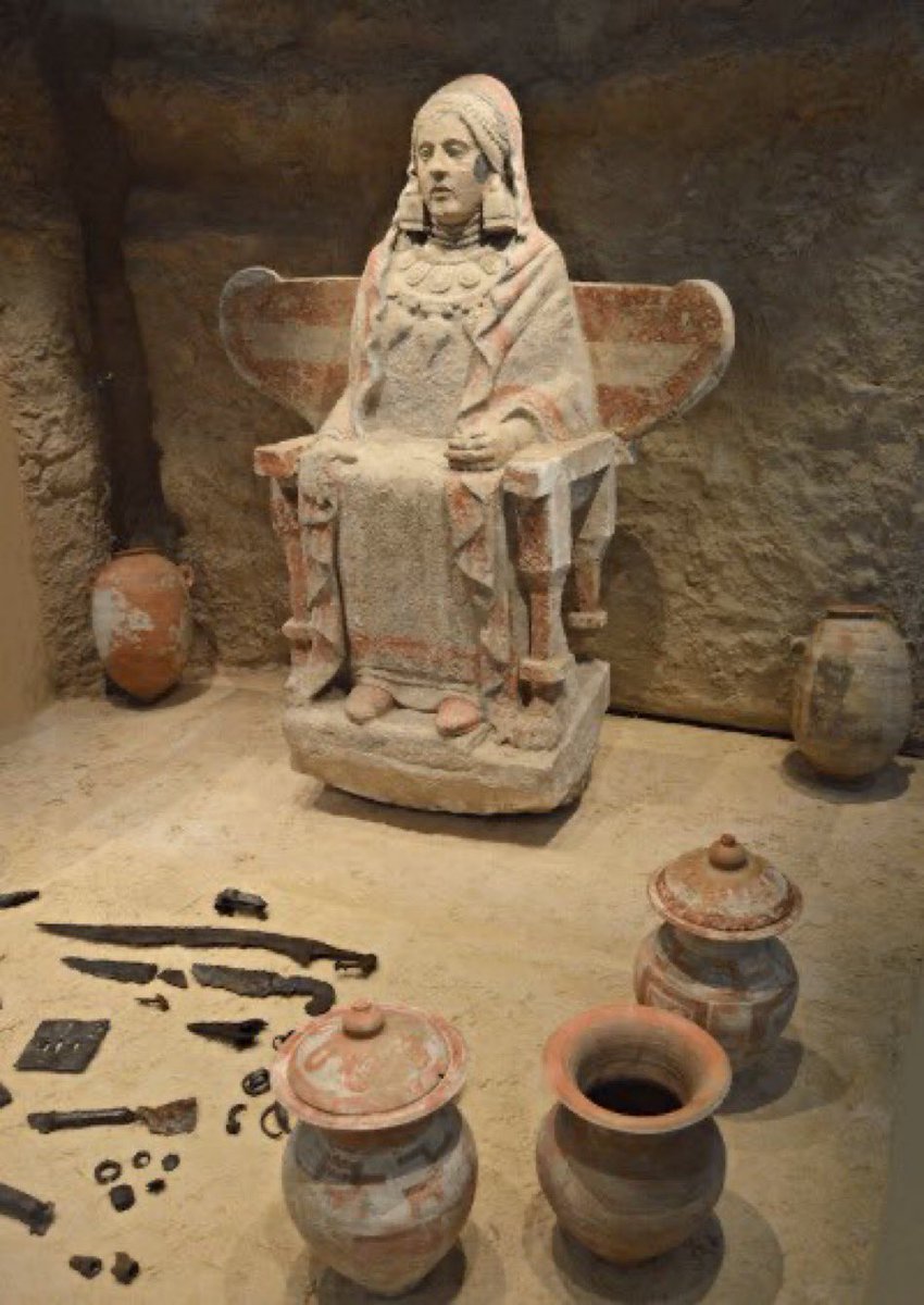 3. Detrás del trono hay una cavidad en la que se encontraron los huesos incinerados de una mujer, posiblemente la mujer representada, por lo que parece que la escultura fue una magnífica urna funeraria.